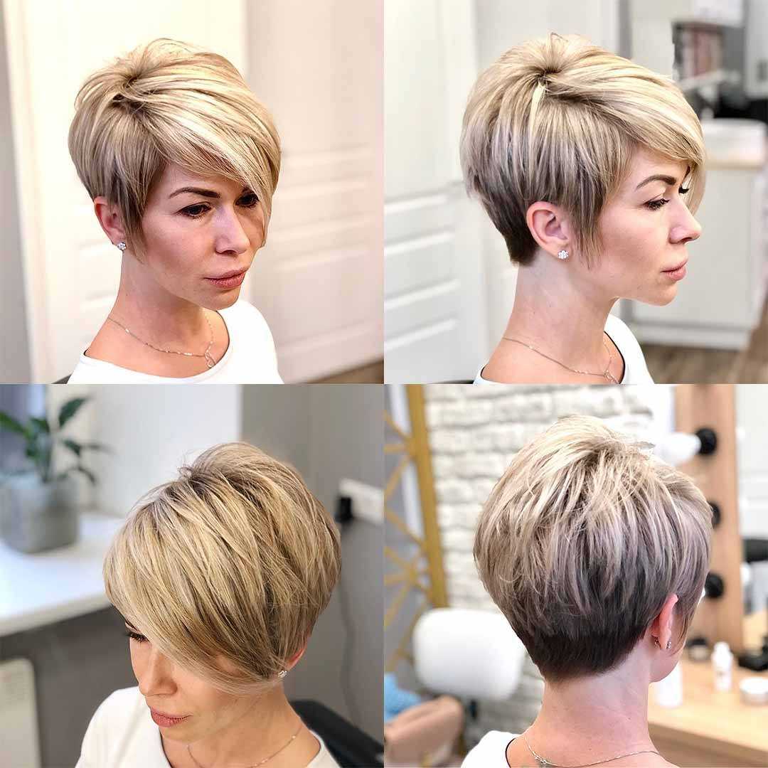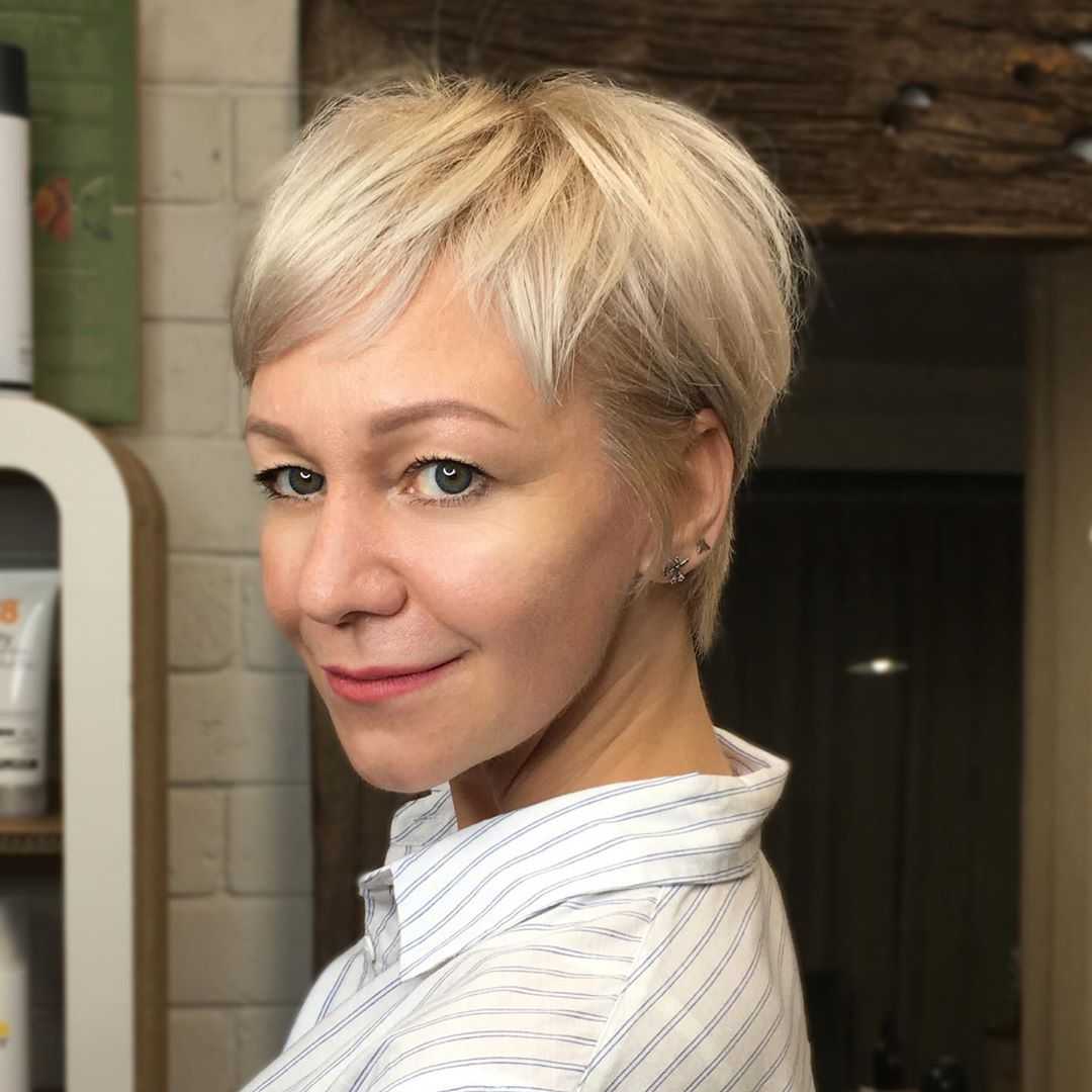 Очень короткая стрижка с большей частью волос выше линии ушей всегда будет выглядеть стильно. Затылок обрезается, челка наклонная, виски удлиненные или короткие. Эта прическа идеально подходит для любого лица (но не круглого) с правильными акцентами