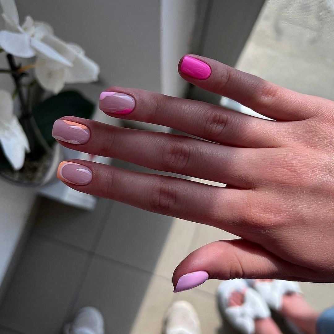Это оформление ноготков вошло в самые красивые новинки весны 2024 года. Сегодня его часто можно увидеть у знаменитостей на фото в интернете. Особенно популярны многоцветные ногти, но нужно, чтобы оттенки были из одной цветовой палитры: конфетно-розовый, красный, абрикосовый, персиковый и оранжевый. Дизайн одного ногтя может выходить за рамки допустимого. Можете покрасить его белым или золотым цветом.