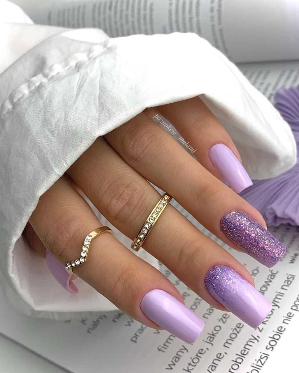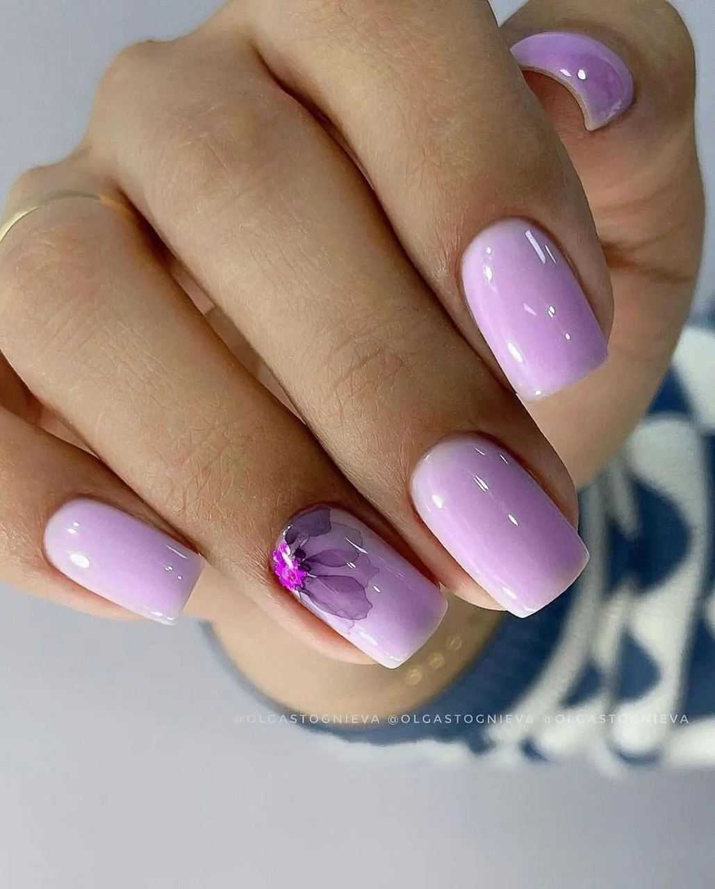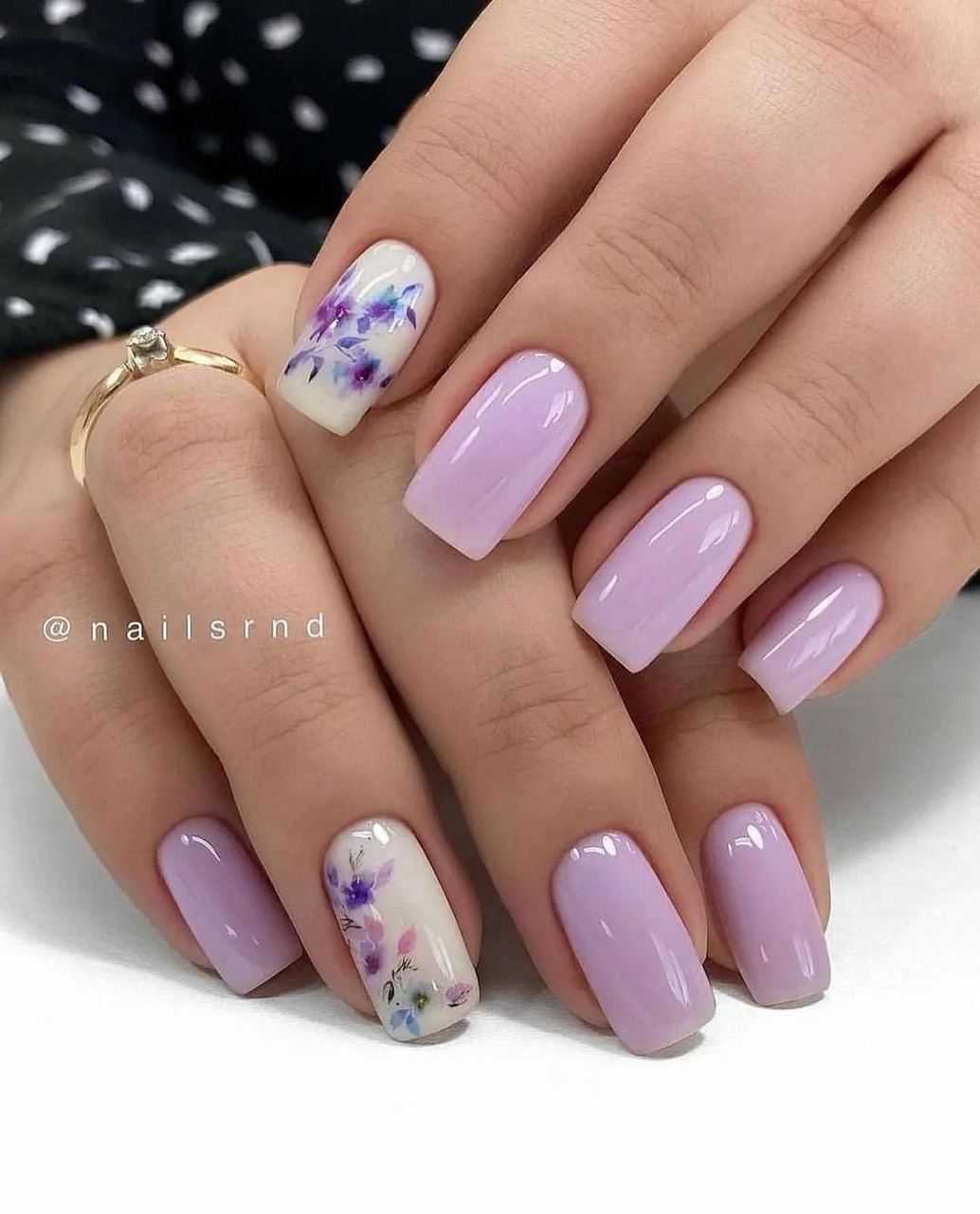 Вариантов оформления ногтей множество, важно правильно сочетать цвета. Отличная идея — сиреневый фон и розовые цветы сверху