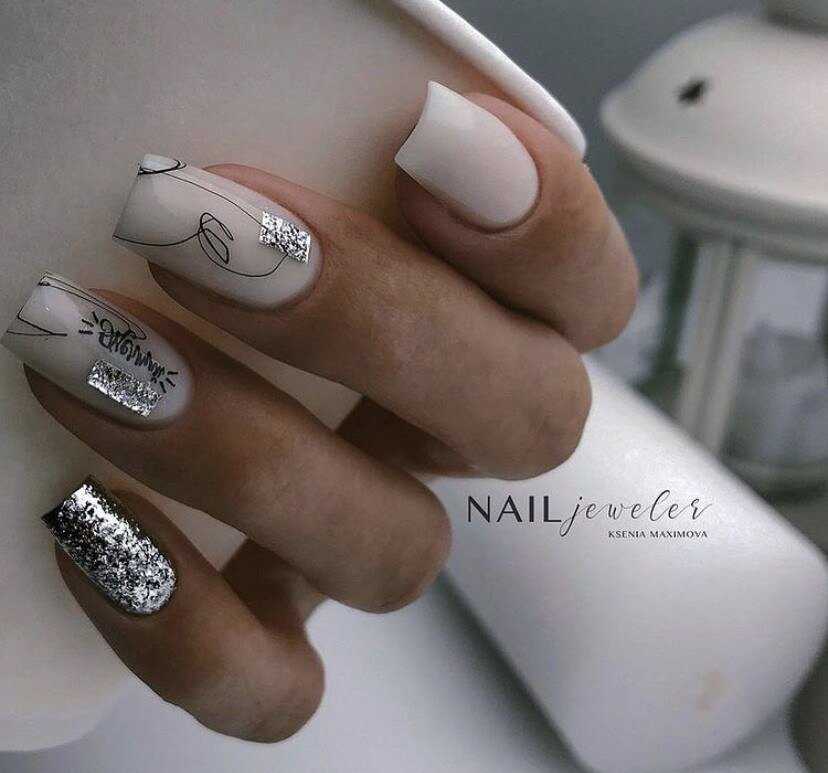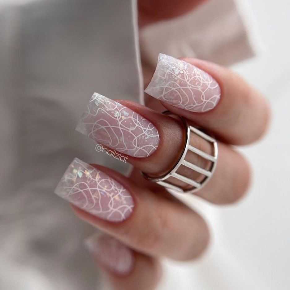 Квадратная форма ногтей может быть как в виде острого квадрата, так и в виде мягкого. Обе формы выглядят очень привлекательно. На квадратной форме ногтей отлично смотрится нежный маникюр в стиле геометрии.