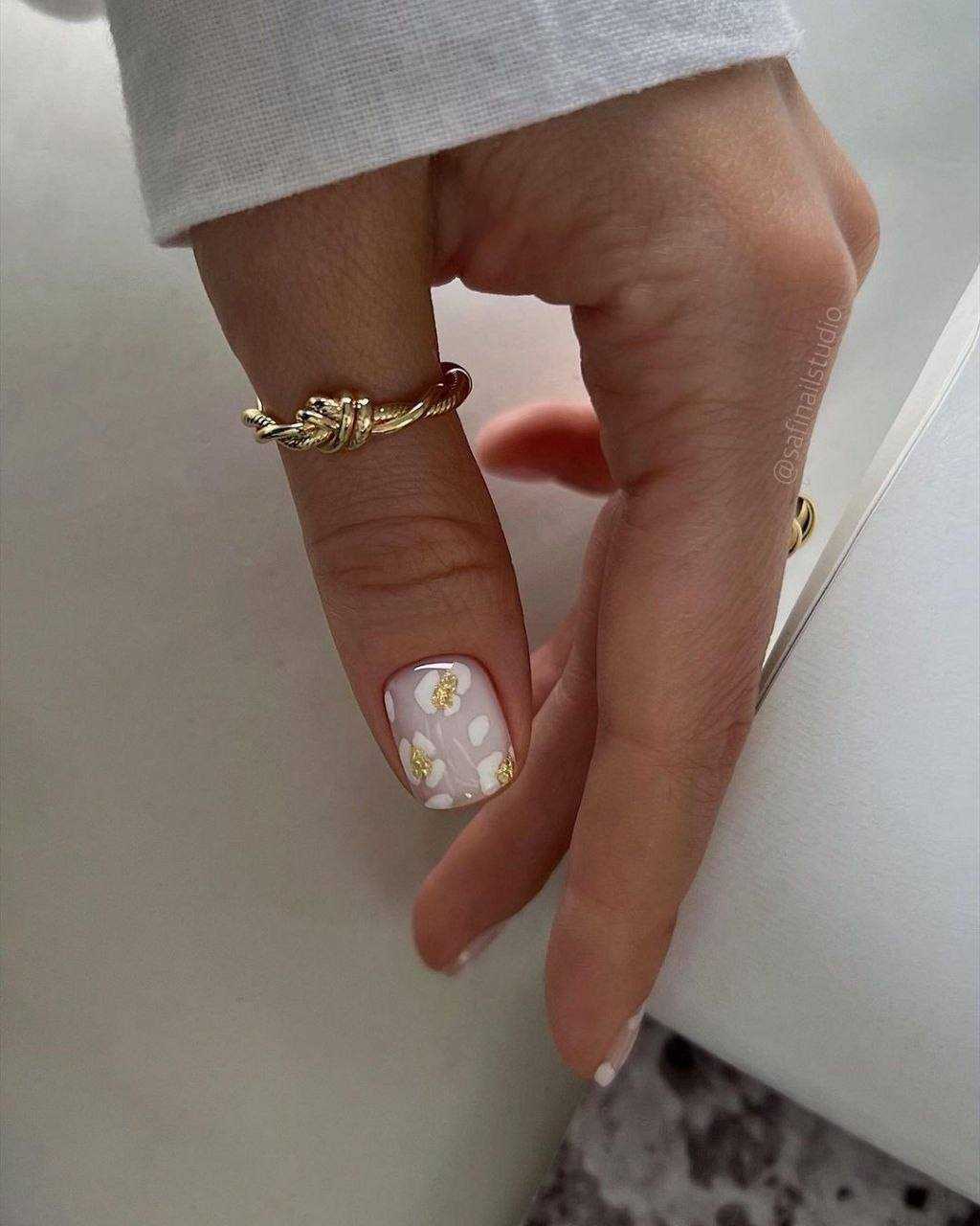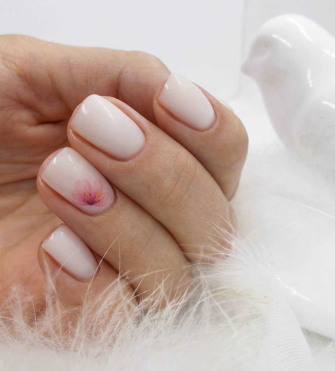 На короткой длине на одну из ногтевых пластин можно добавить несложные цветочные рисунки, выполненные мастером или воспользоваться готовыми стикерами.