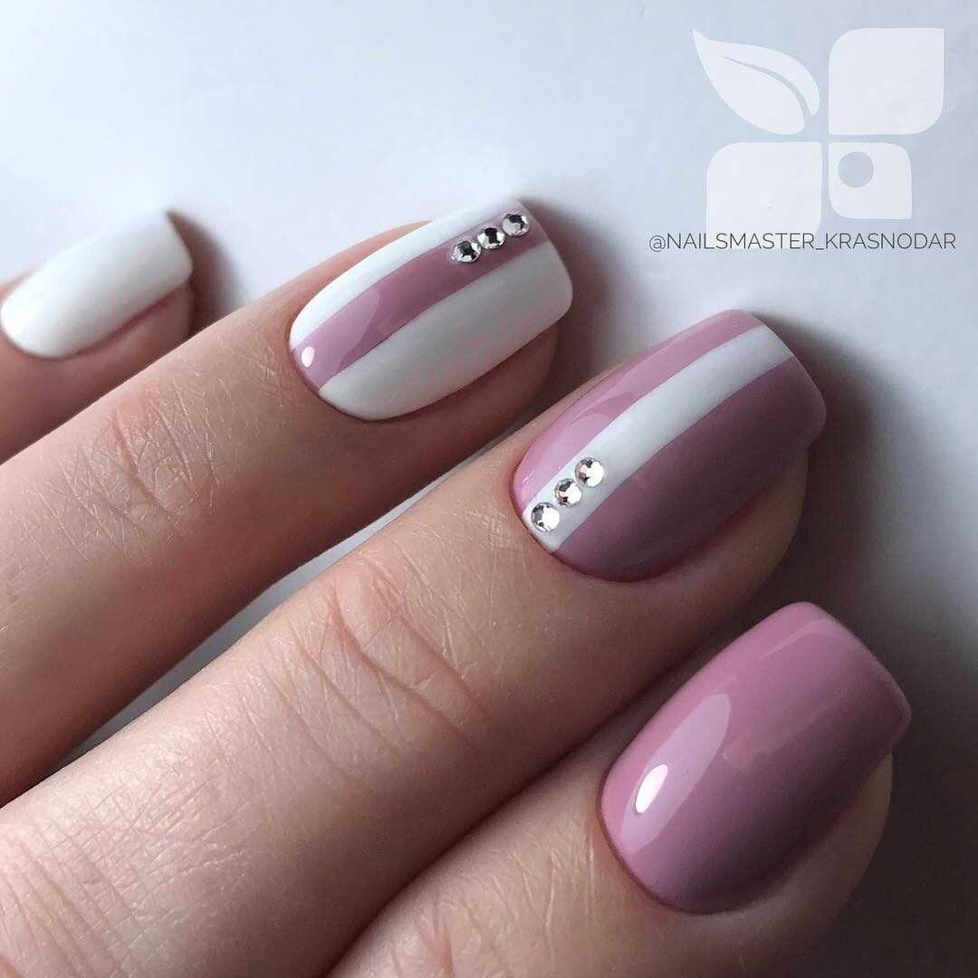 | Длинные | 1. Розовый маникюр с белыми акцентами и стразами. |
