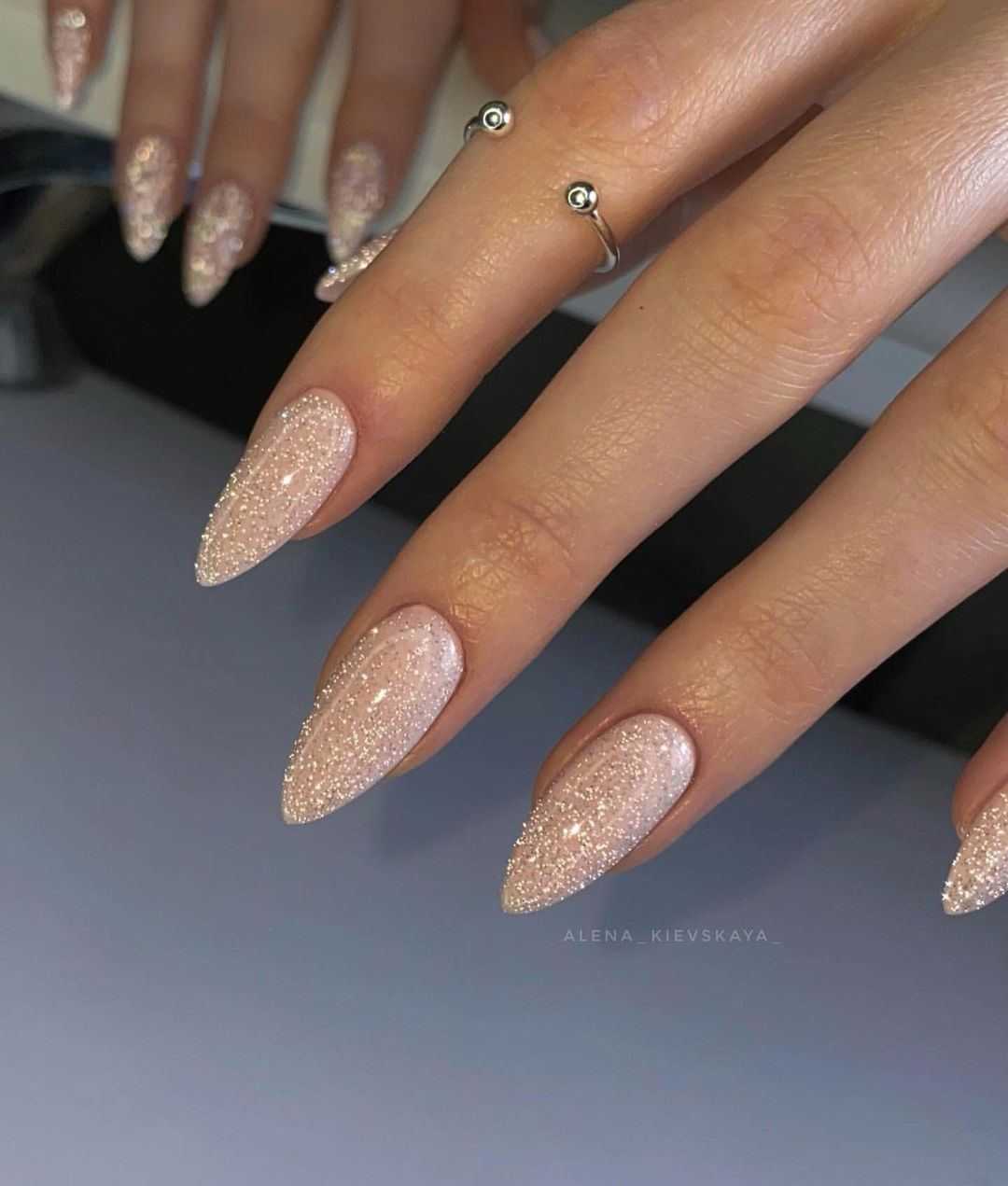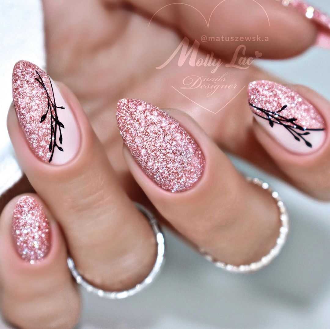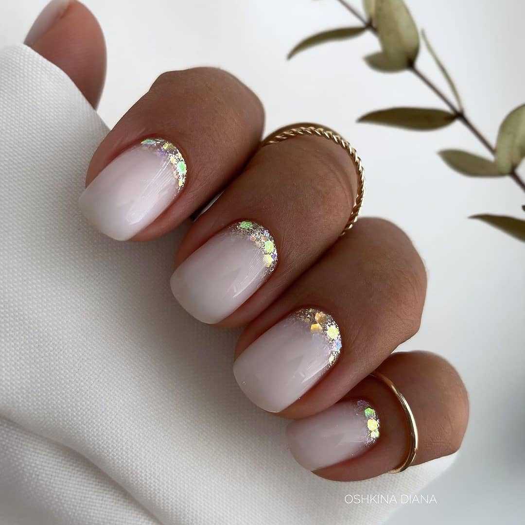 Такой вид декора, как блёстки просто идеально подходит для украшения коротких ногтей, поскольку блестящие частицы имеют разный размер, цвет и форму, а также лишены объёма, что позволит избежать в процессе оформления визуального утяжеления ногтевых пластин в целом. Нежный маникюр с блёстками, который стал одним из трендовых, представляет собой лаконичные идеи оформления в светлых тонах с минимальным количеством сверкающих деталей. Иными словами, блёстки приемлемо использовать для дополнения рисунка либо особенностей выбранной техники, например, прорисовки линии улыбки френча при помощи глиттера либо шиммера.