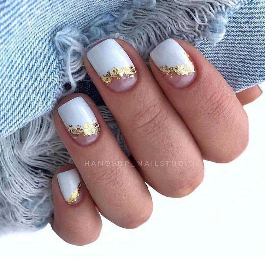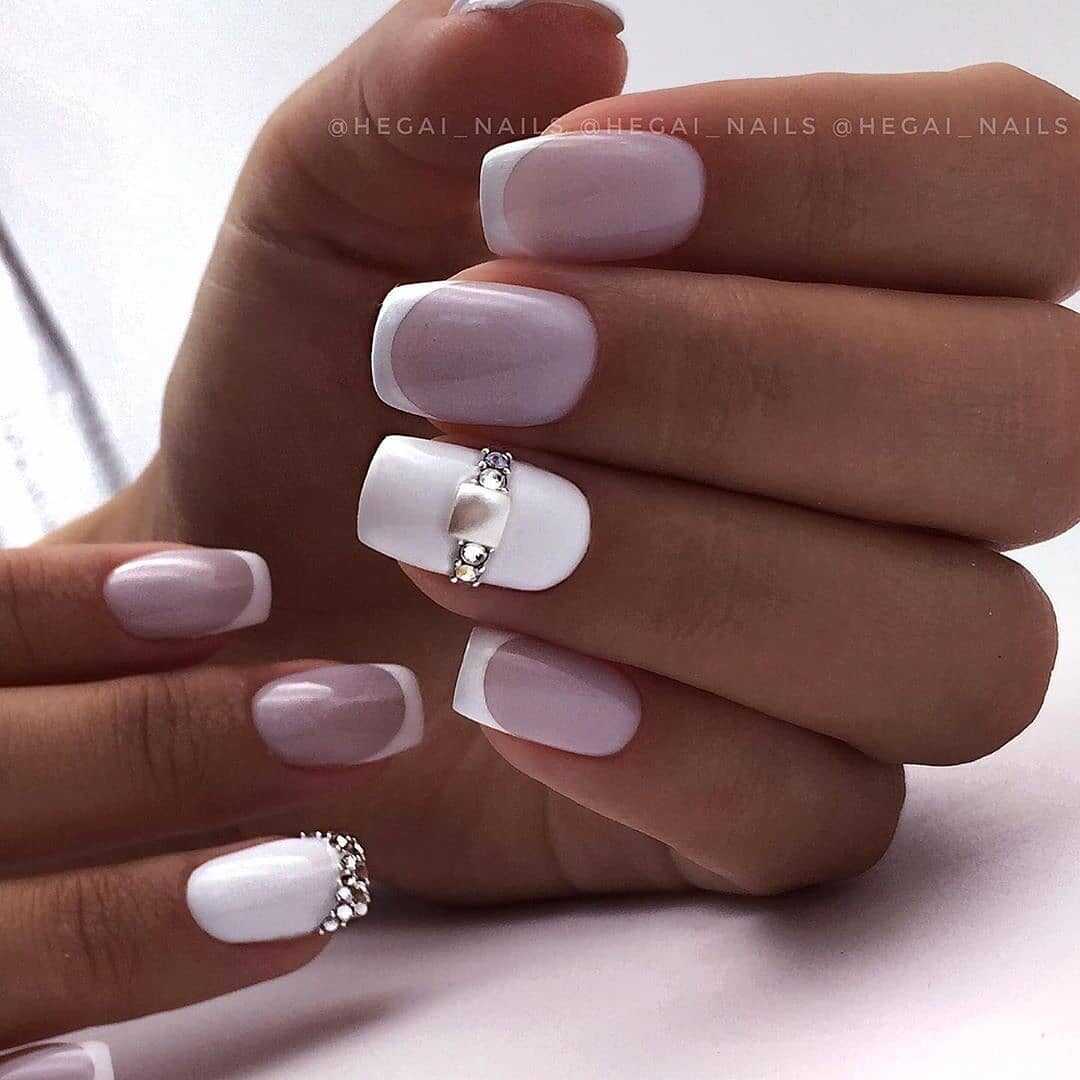 Классический французский маникюр с белым цветом на кончиках ногтей можно дополнить перламутровым блеском, который придаст маникюру нежное сияние. Это создаст романтичный и воздушный вид.