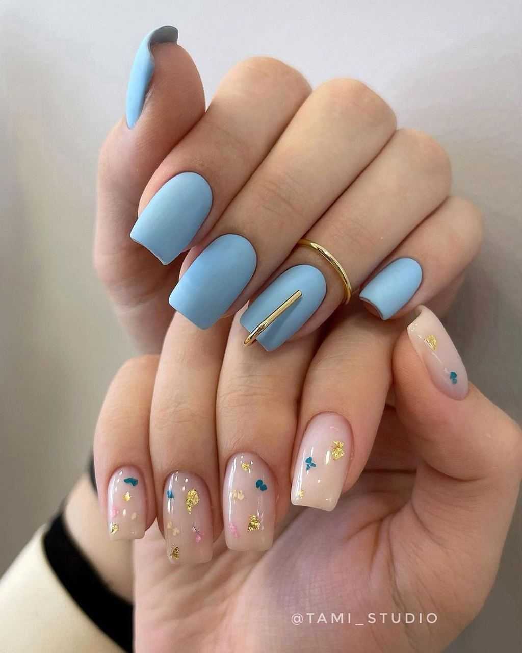 Бархатистая поверхность матового топа волшебным образом сглаживает даже самые яркие оттенки лака. Поэтому, для создания нежного маникюра на короткую длину можно использовать не только светлые оттенки, но и, например, красный, синий либо коричневый. Матовая основа гармонично сочетается с градиентом и различными узорами, блестящими полосками и стразами на паре ноготков. Не менее интересным вариантом можно назвать комбинированный дизайн, в котором матовая структура сочетается на ногтях с глянцем, лунным дизайном либо «голыми участками».
