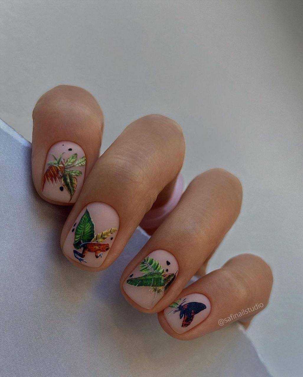 - Прекрасно смотрятся прорисованные цветочные мотивы или животные принты. Добавление страз придает образу роскошь и изящность. Элементы фольги подчеркивают нежность выбранного образа. Длинные ногти с нежным маникюром дополнят любой романтический образ.