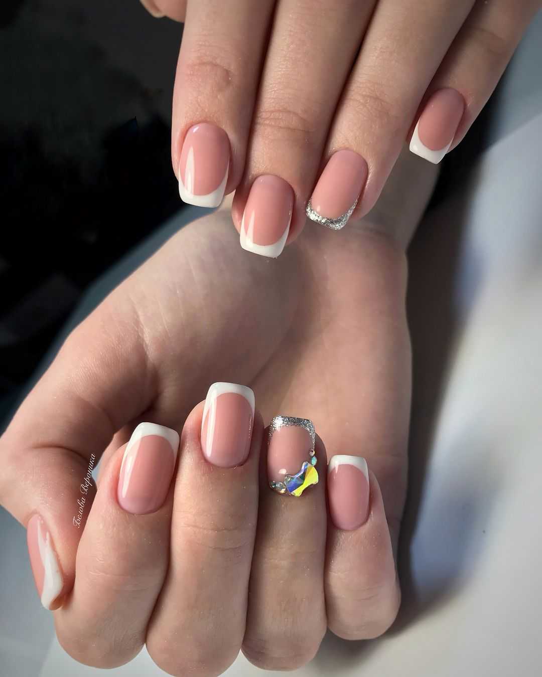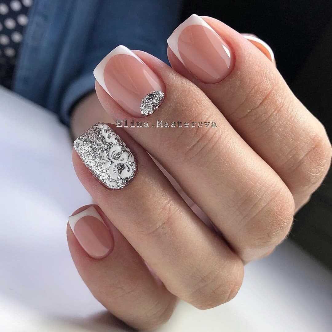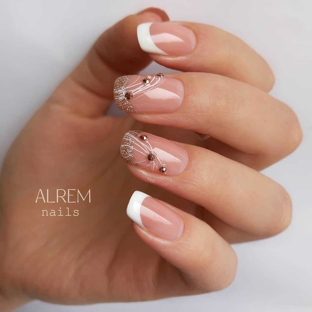 Скучные нюдовые тона френча умело разбавляются не только добавлением контрастных цветов, но и добавлением блестков серебра или золота. Небольшие детали дизайна, как рисунки и стразы привносят нежные нотки в такой, казалось бы строгий маникюр как френч. Главное — соблюсти меру.