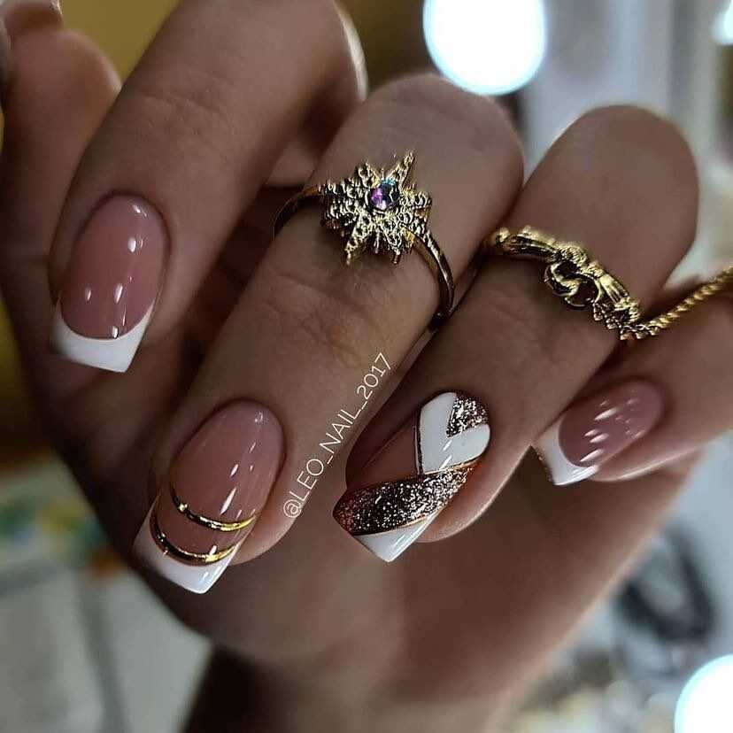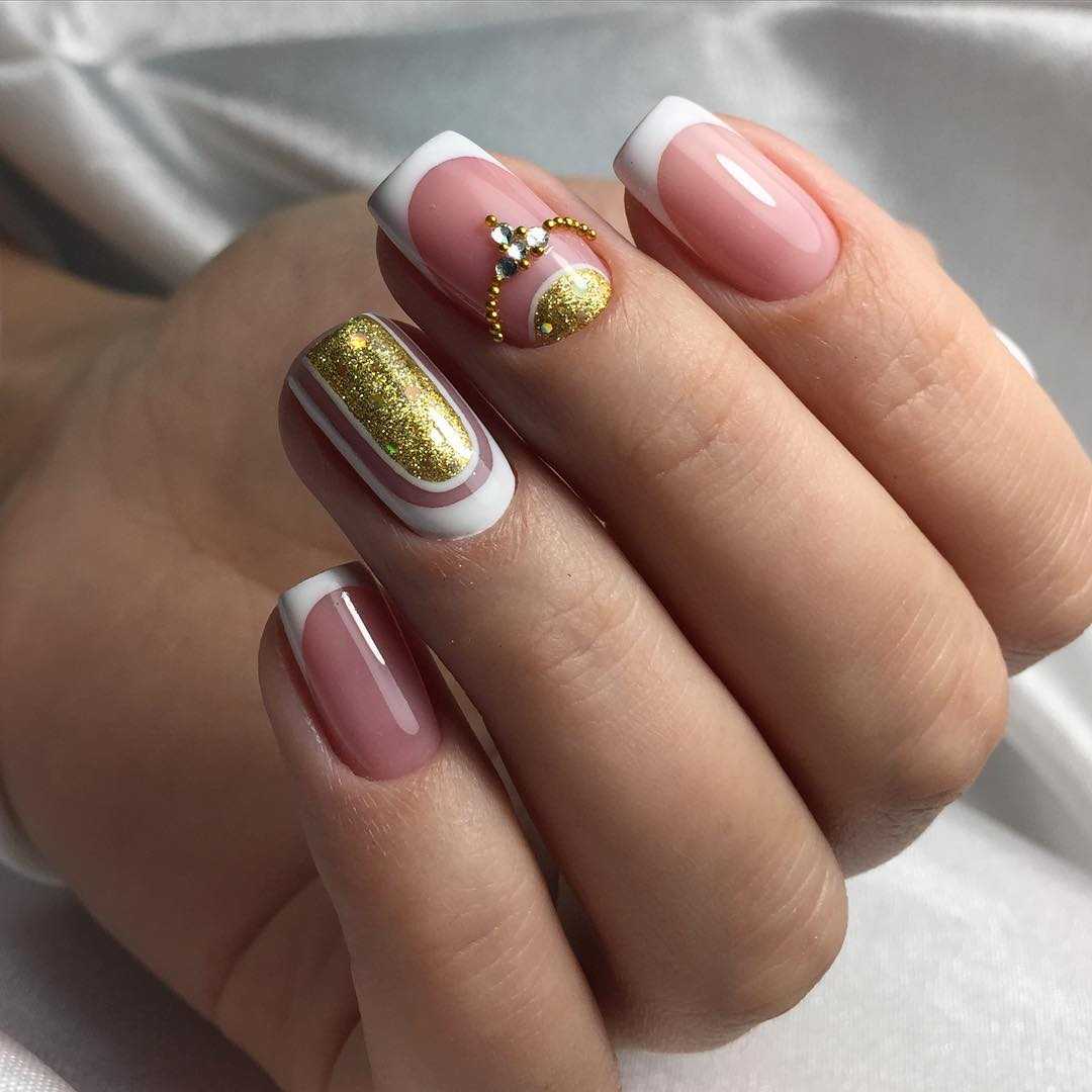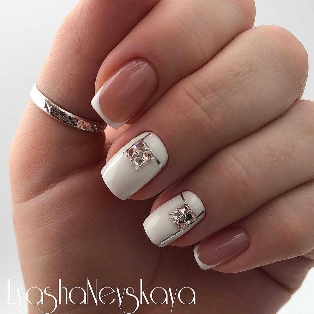 Скучные нюдовые тона френча умело разбавляются не только добавлением контрастных цветов, но и добавлением блестков серебра или золота. Небольшие детали дизайна, как рисунки и стразы привносят нежные нотки в такой, казалось бы строгий маникюр как френч. Главное — соблюсти меру.