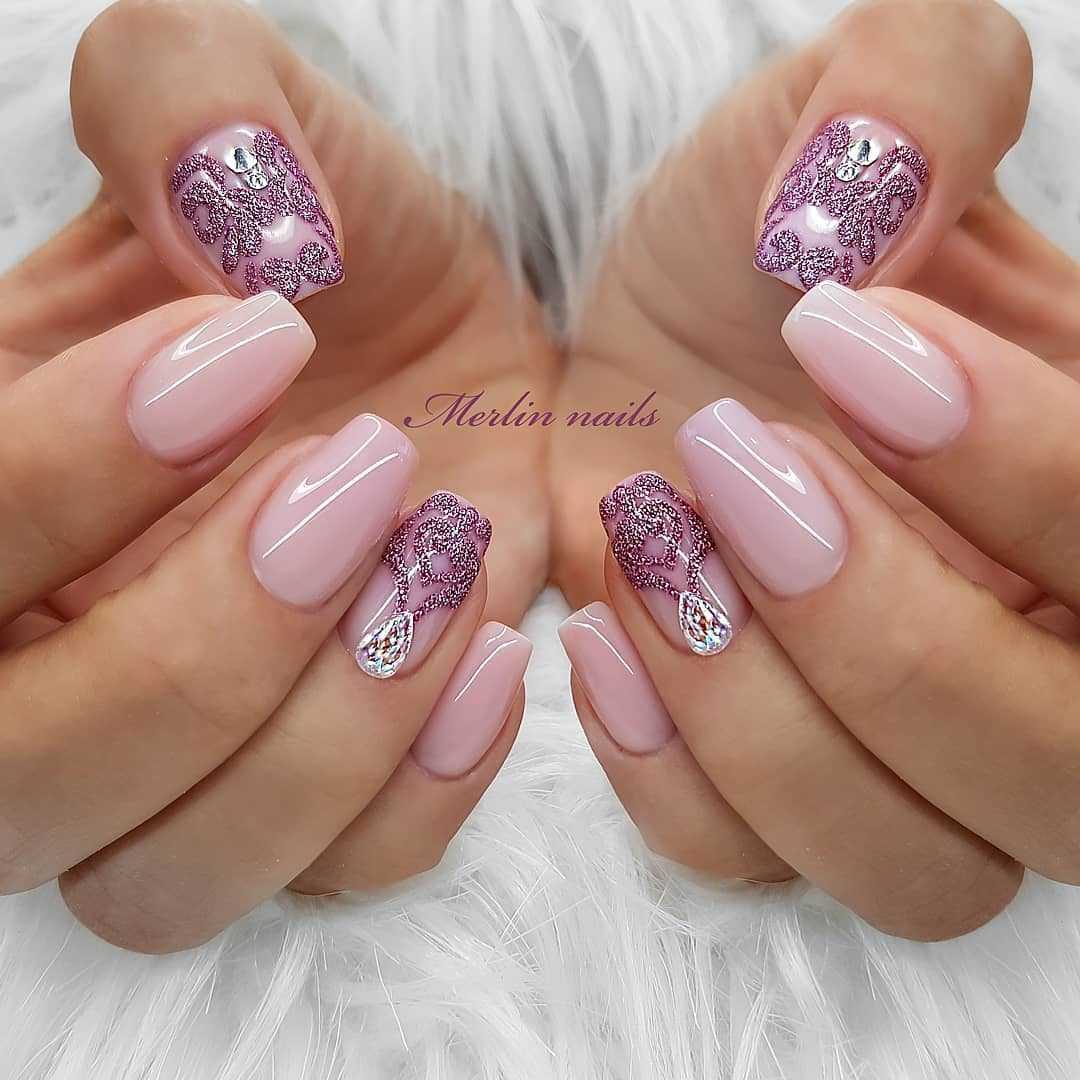 - Также для свадебного маникюра популярностью пользуется кружевной дизайн и жемчужная втирка. Для дополнения образа невесты используются нежно-розовые, белые, кремовые, нежно-сиреневые и небесно-голубые оттенки.