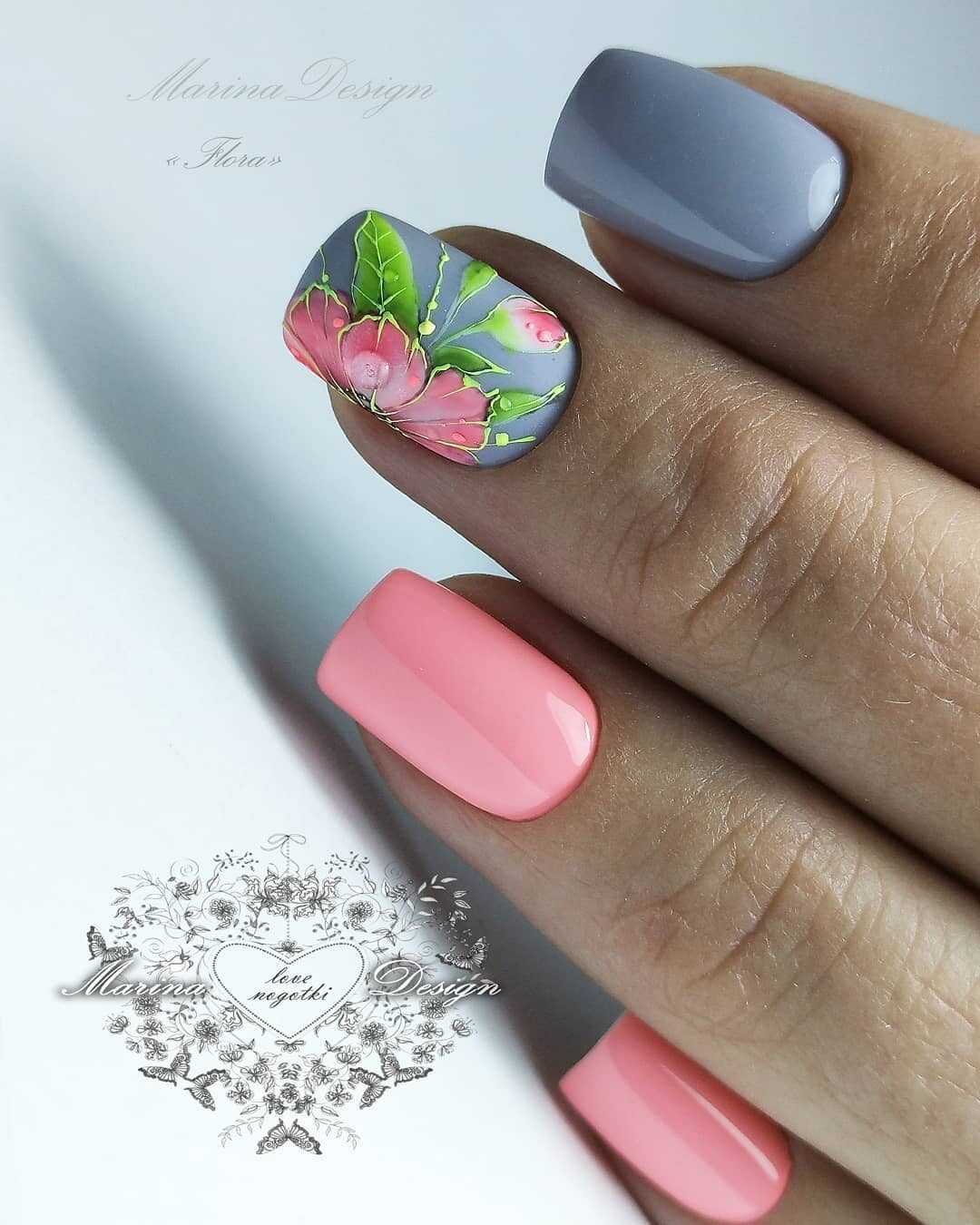 Здесь властвуют яркие оттенки — красный, оранжевый, зеленый, серый и коричневый. Для создания нежного маникюра берите эти активные оттенки, но преобразуйте их. Вместо оранжевого подойдет коралловый, красный меняем на розовый, темный серый на пастельный, а коричневый заменим оттенком капучино.