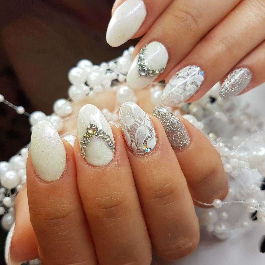 - Выделение нескольких ногтей покрытием с добавлением блесток, фольги или страз подчеркнет женственность и нежность обладательницы маникюра. Мастер ногтевого сервиса всегда отталкивается от предпочтений невесты и ее образа.
