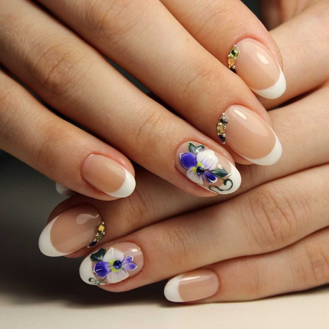 Наиболее популярен маникюр с добавлением страз, специальных наклеек, фольги и других материалов декора. На данной форме ногтей прекрасно смотрятся цветочные мотивы.