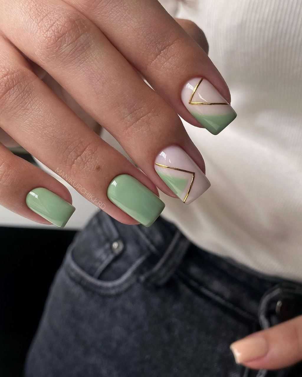 Маникюр с геометрическими фигурами понравится любительницам классики. Квадраты, кружочки, треугольники — все это в моде. Они могут быть разных размеров и цветов. Можно украсить все ногти, а можно только несколько. Подойдите к этому дизайну с творческой стороны и создайте с помощью фигур какой-то рисунок.