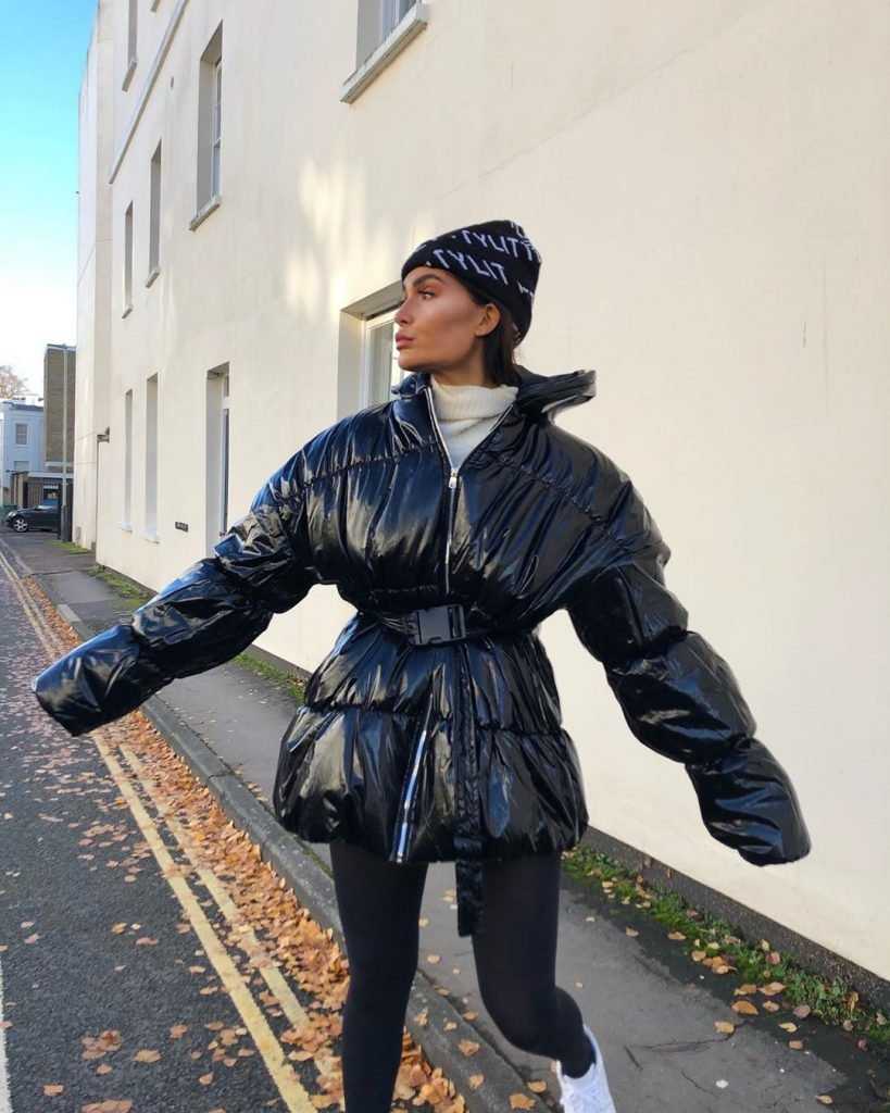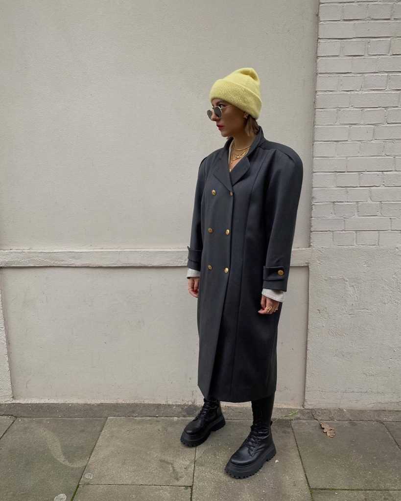 Шапки, связанные из толстых нитей, рекомендуется носить с объёмной верхней одеждой оверсайз. В качестве последней выступают пальто, куртки, пуховики и полушубки.
