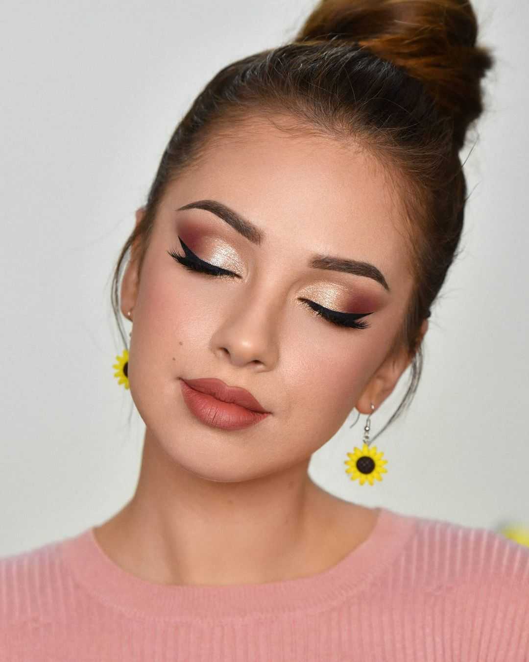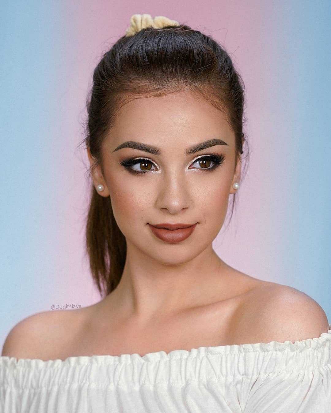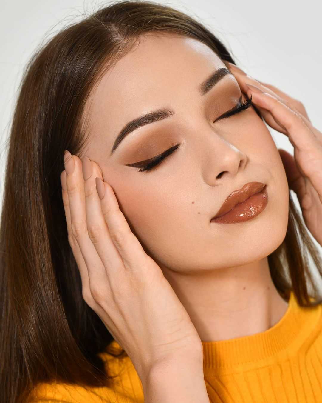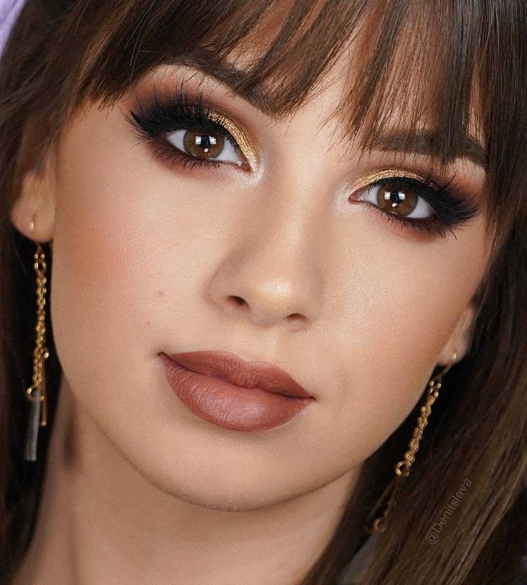 - Карие. Широкая палитра цветов от «кофе с молоком» до глубокого шоколада гармонично вписывается в макияж кареглазых девушек. Можно расставить яркие акценты с помощью насыщенного сливового или небесного синего.