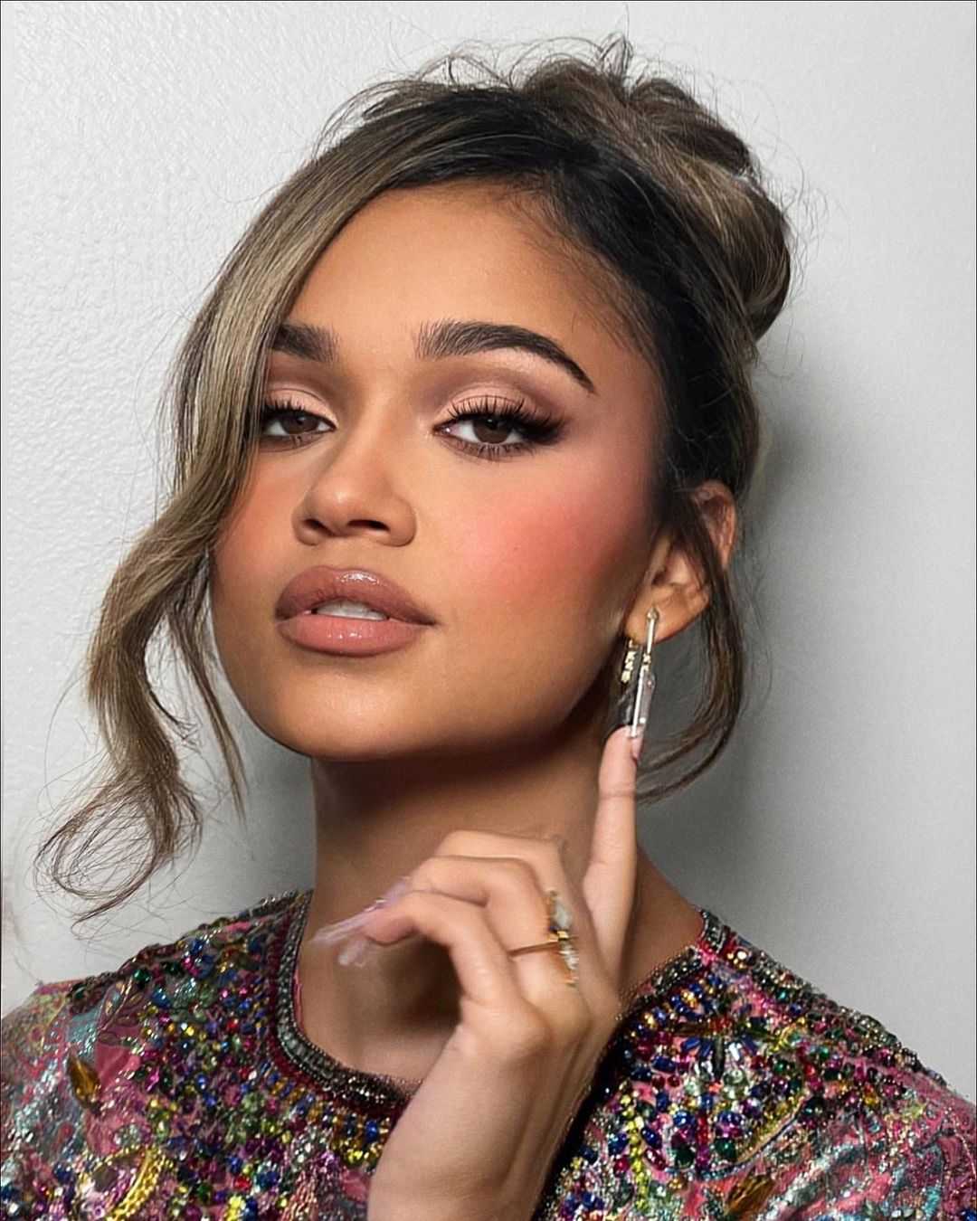 Модный в этом сезоне макияж в стиле nude — натуральная красота с применением блеска на коже, то есть эффекта сияния. Не допускается использование теней и стрелок, глаза выделяются за счёт ресниц. Брови должны выглядеть натурально с естественным цветом. Губы можно накрасить помадой естественного цвета или прозрачным блеском, как на фото.