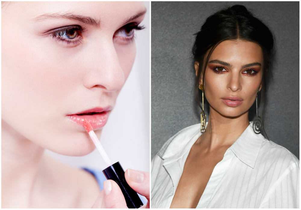- Нюдовый блеск или бесцветная помада – универсальное решение. Любительницы минимализма смогут совместить подобный макияж губ с нейтральными бежевыми или светло-розовыми, серыми тенями на глазах. Другая тенденция – комбинирование нейтральной помады с тенями насыщенных оттенков, объемными стрелками, блестками, нанесенными на веки. Последний вариант станет идеальным решением при создании вечернего запоминающегося макияжа.