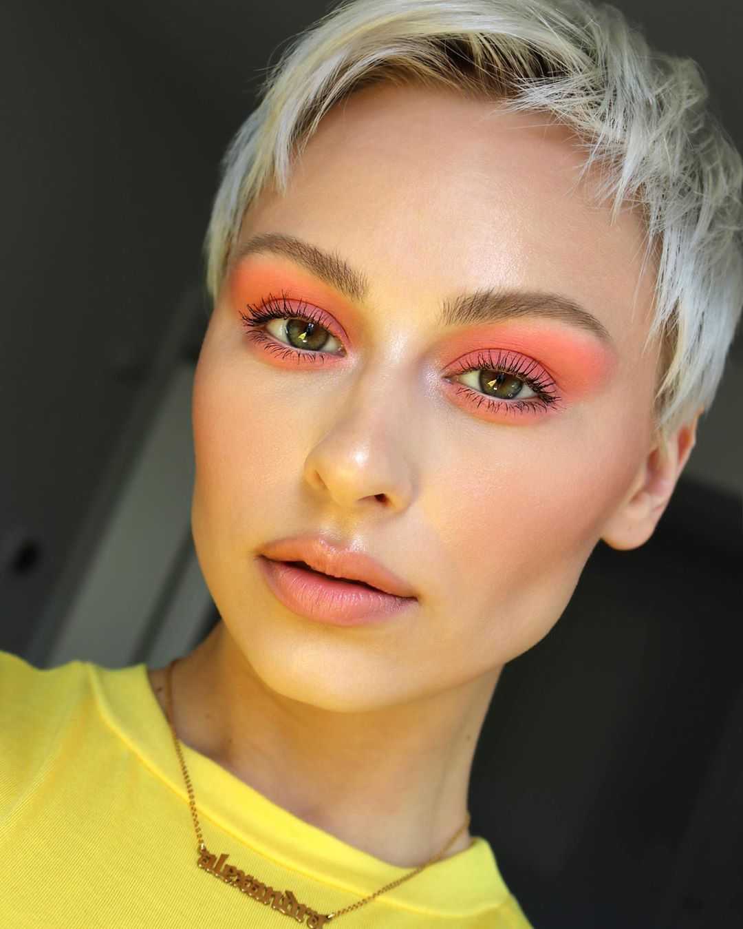 коралловую помаду рекомендуется совмещать с тенями оттенка шампани;