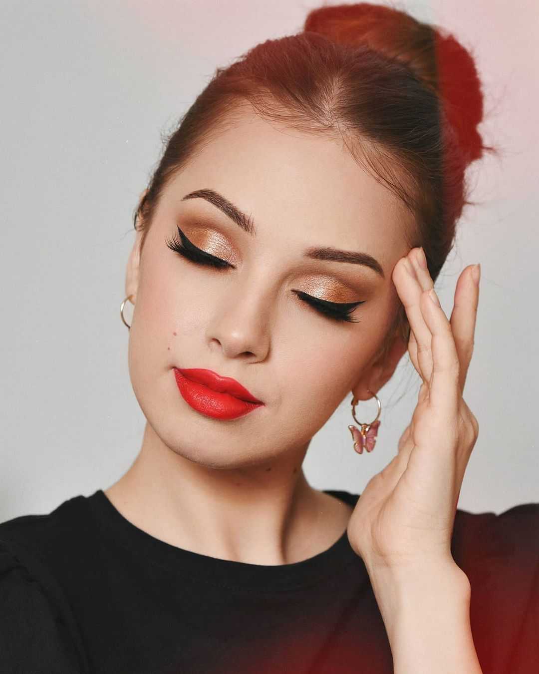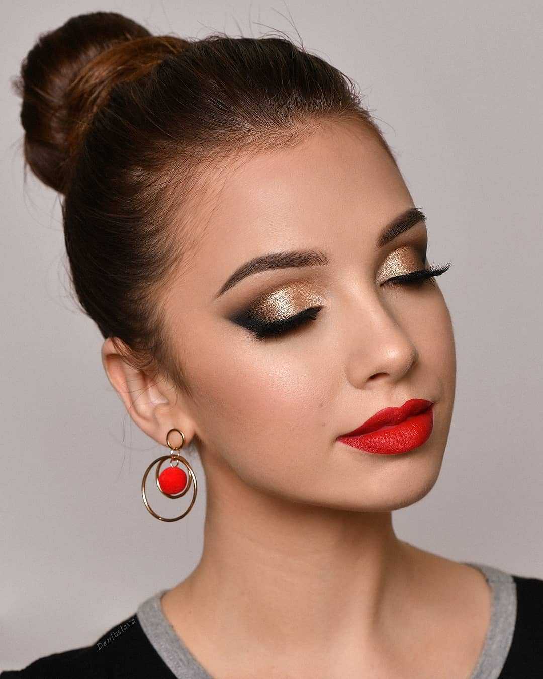 для вечернего макияжа станет находкой комбинация алой помады и золотистых теней;