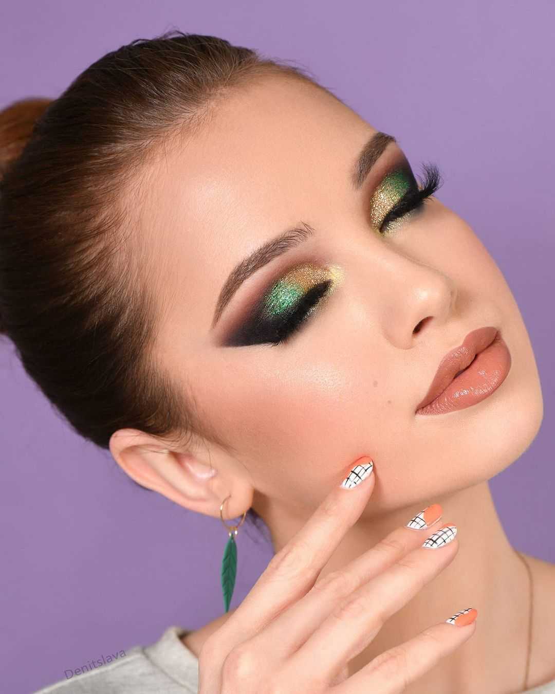 персиковую помаду совмещают с изумрудными тенями, нанесенными на веки;