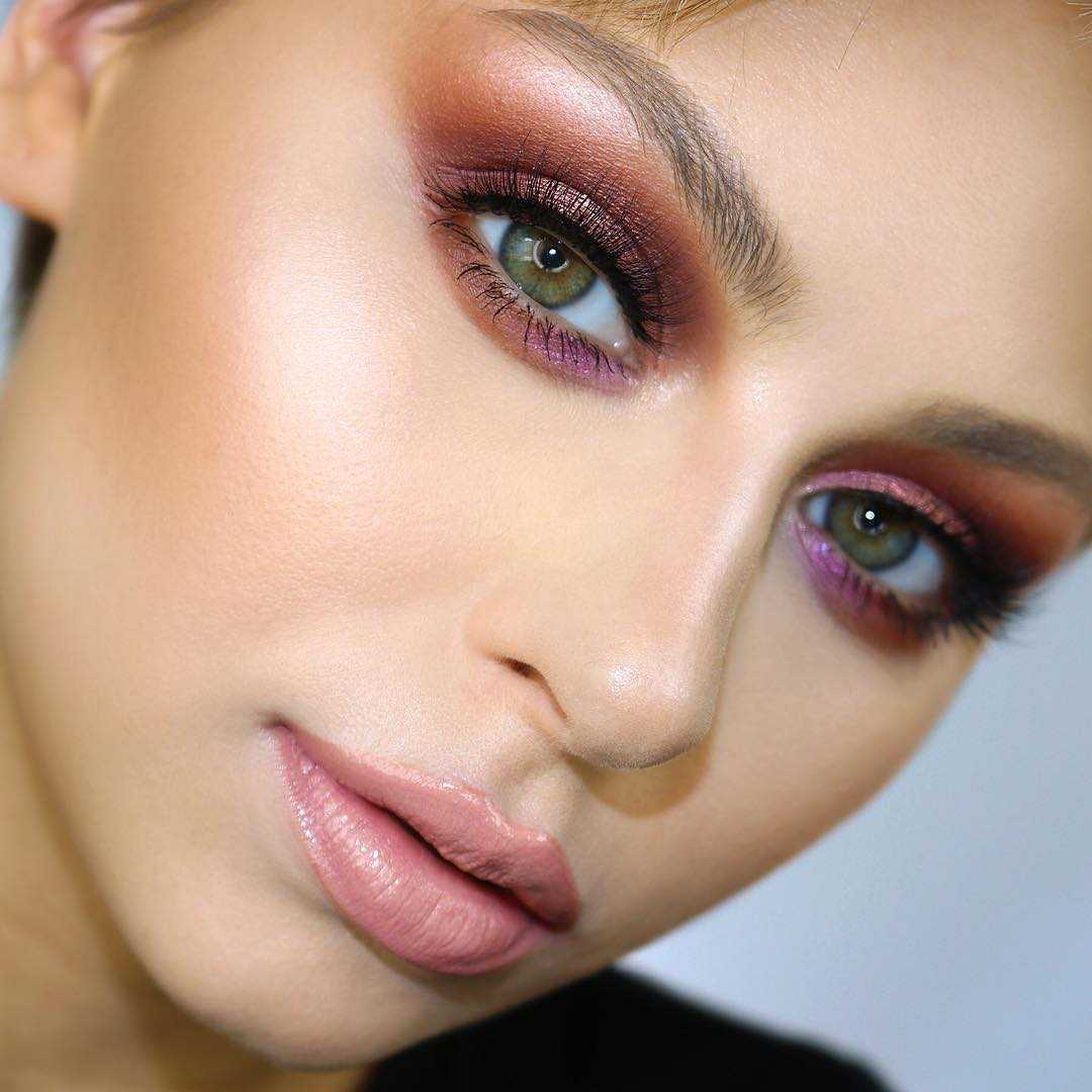 нюд на губах выигрышно подчеркнет фиолетовые тени. Образ получится гармоничным и не перегруженным;