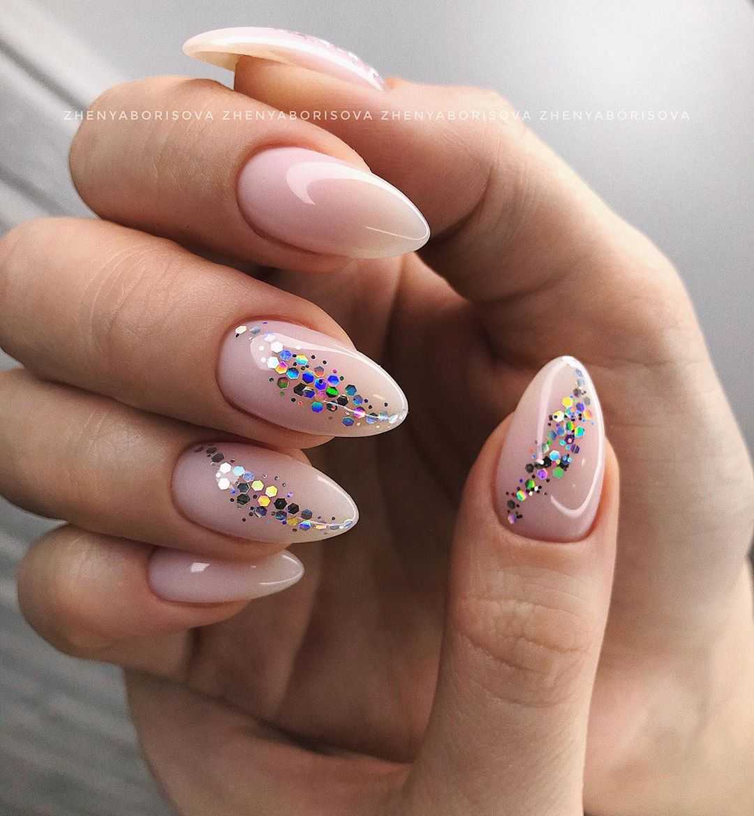 Самый легкий и быстрый вариант — нанести беспорядочно несколько штрихов глиттером и ваши ногти приобретут нарядный, утонченный вид. Это не займет много времени.