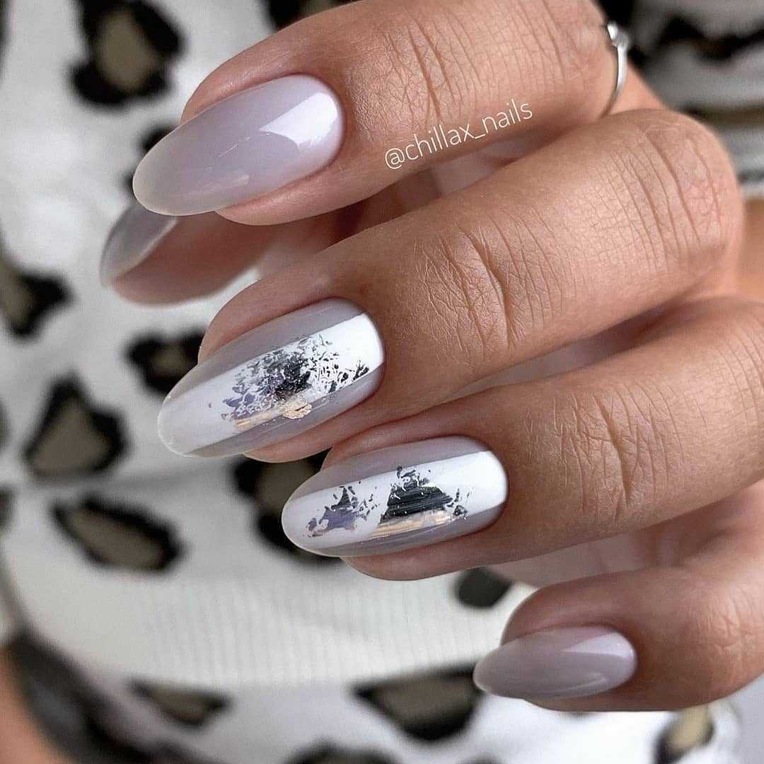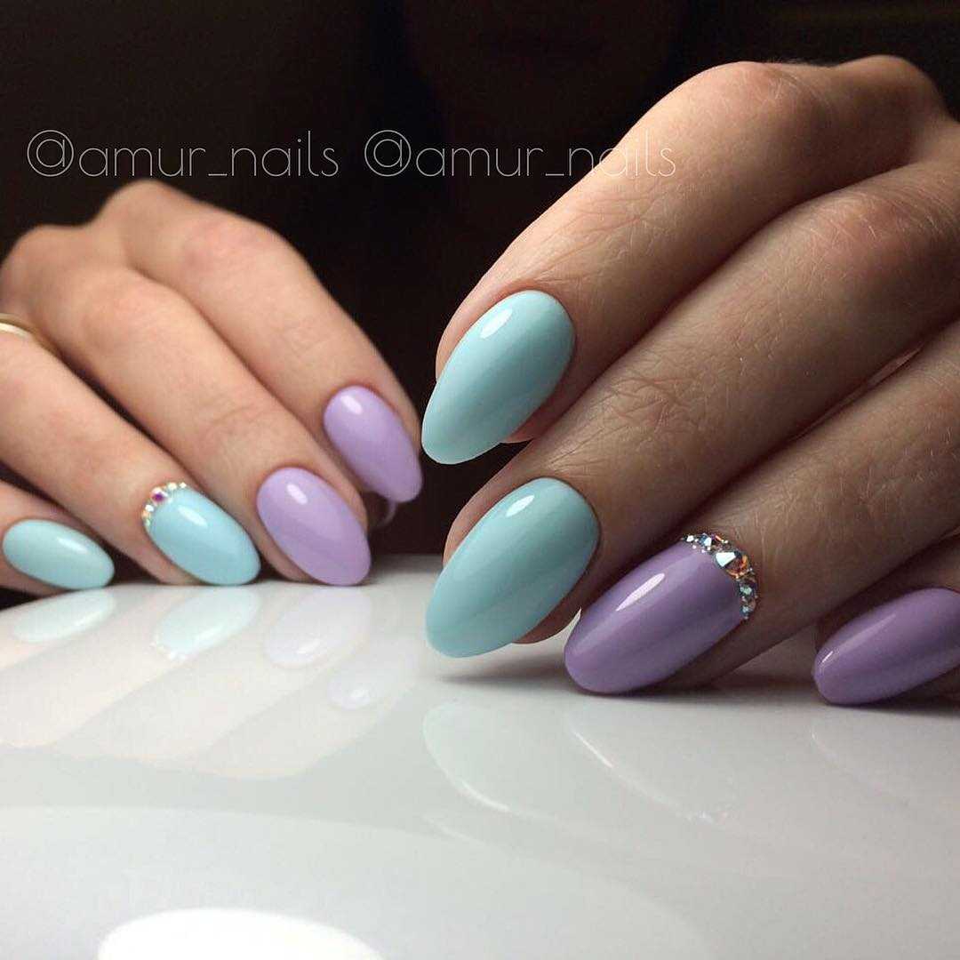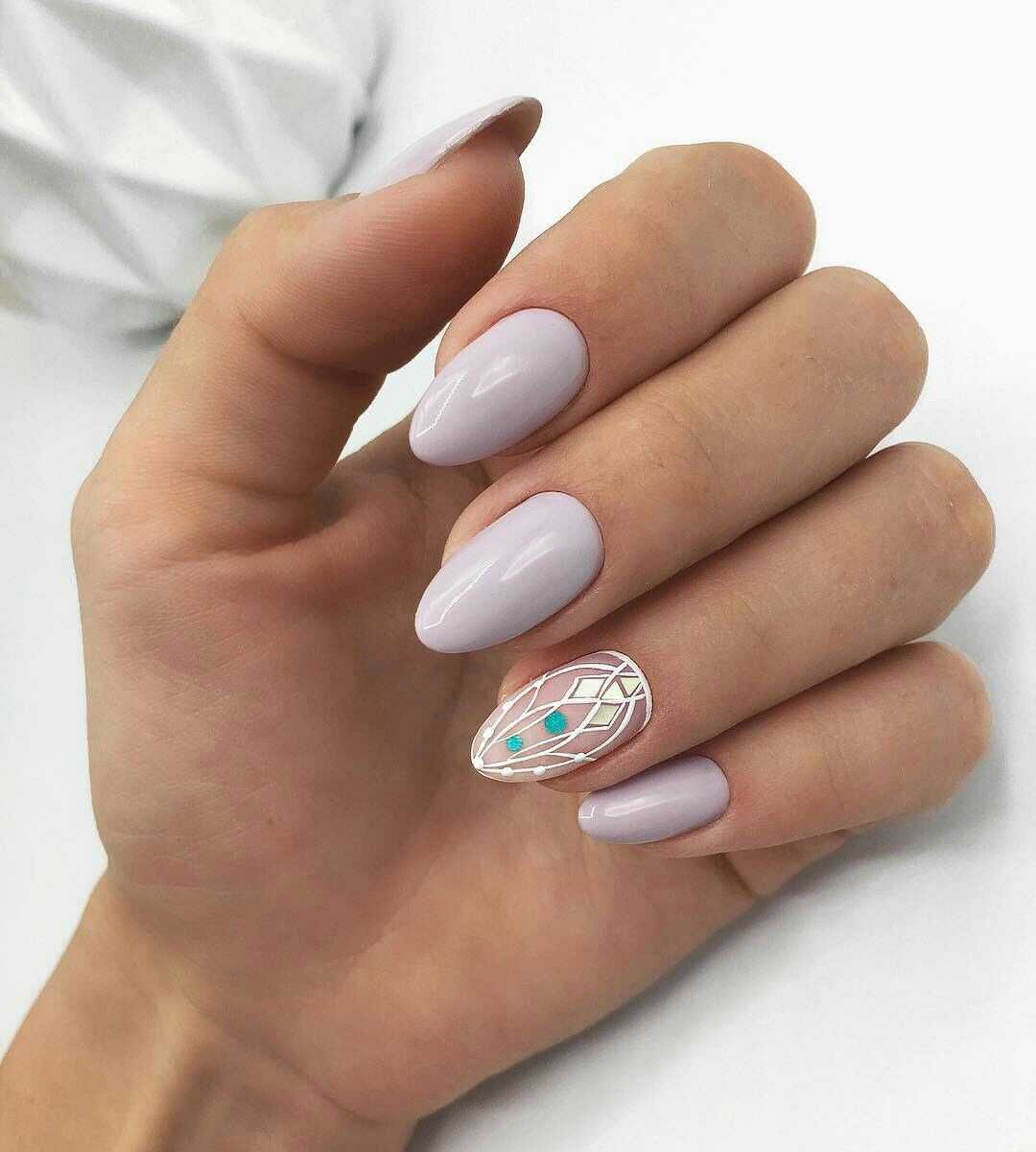 Овальная форма ногтей также имеет большое количество поклонников. Овальный маникюр естественен и практичен, при необходимости помогает скорректировать асимметричную форму ногтевой пластины. Ограниченные оттенки розового, голубого, персикового, мятного, серого, бежевого стали модными цветами нежного овального маникюра в этом году, для чего выбирают соответствующие актуальным нейл-дизайнам. Среди них декор разными видами блестящей фольги, например «битое стекло», матовая отделка, дизайны с блестками, декоративными камнями, жемчугом, стразами, разные тематические виды принтов.