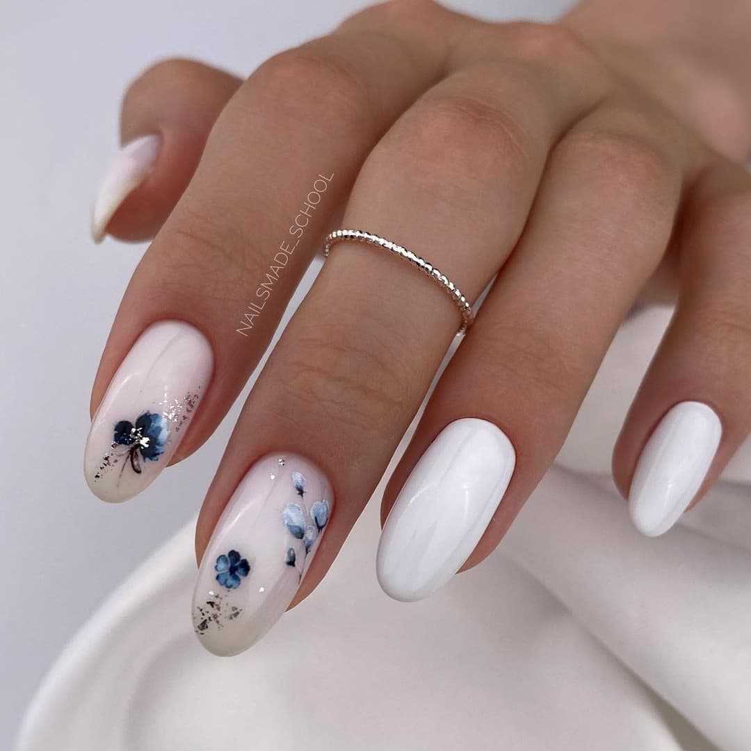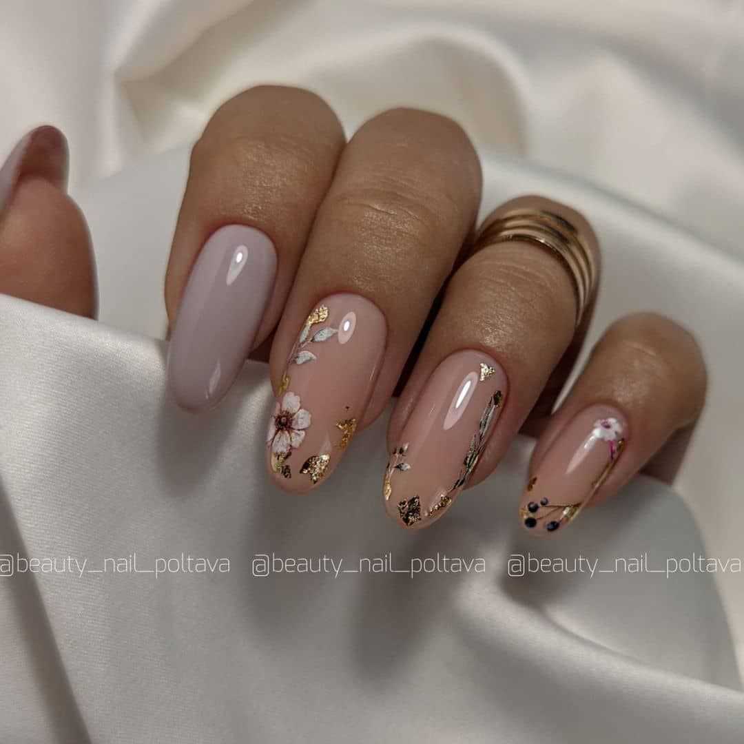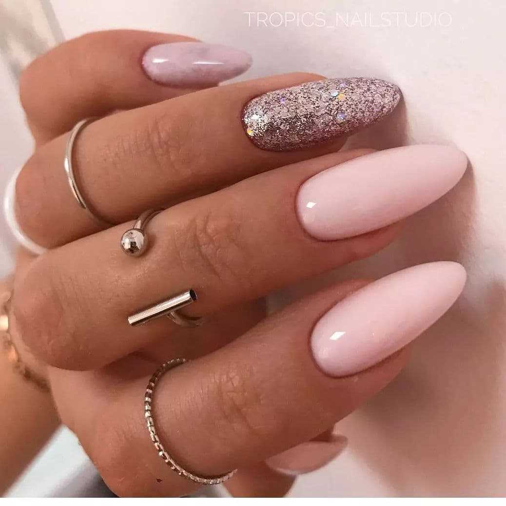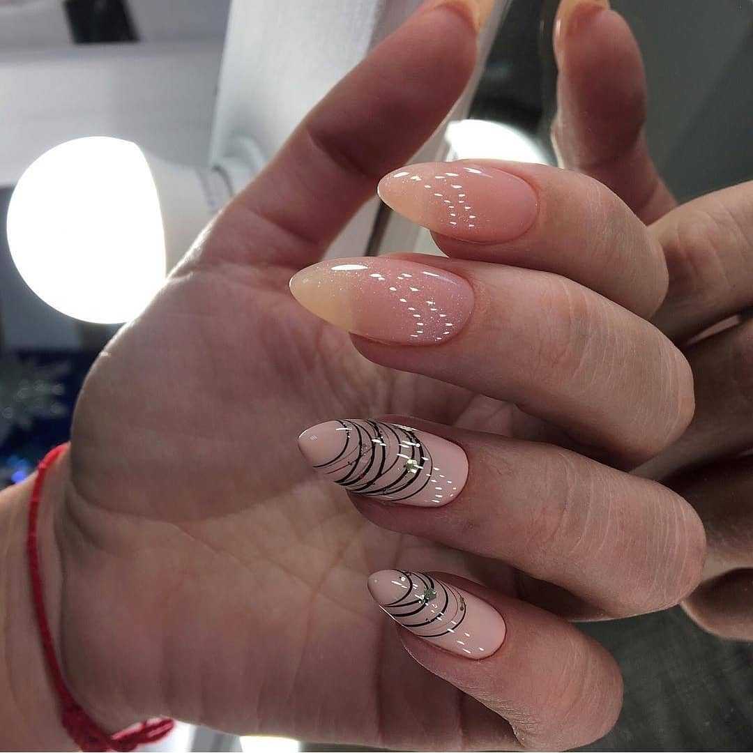 Овальная форма ногтей также имеет большое количество поклонников. Овальный маникюр естественен и практичен, при необходимости помогает скорректировать асимметричную форму ногтевой пластины. Ограниченные оттенки розового, голубого, персикового, мятного, серого, бежевого стали модными цветами нежного овального маникюра в этом году, для чего выбирают соответствующие актуальным нейл-дизайнам. Среди них декор разными видами блестящей фольги, например «битое стекло», матовая отделка, дизайны с блестками, декоративными камнями, жемчугом, стразами, разные тематические виды принтов.