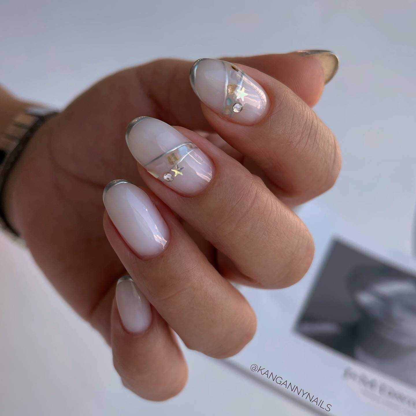 Вариаций использования полупрозрачных тонов множество. Удивительно, но они подходят не только для создания повседневной носки, но и для натурального праздничного, тут главное правильный декор. К тому же маникюр хорош и на коротких, и на длинных ногтях.