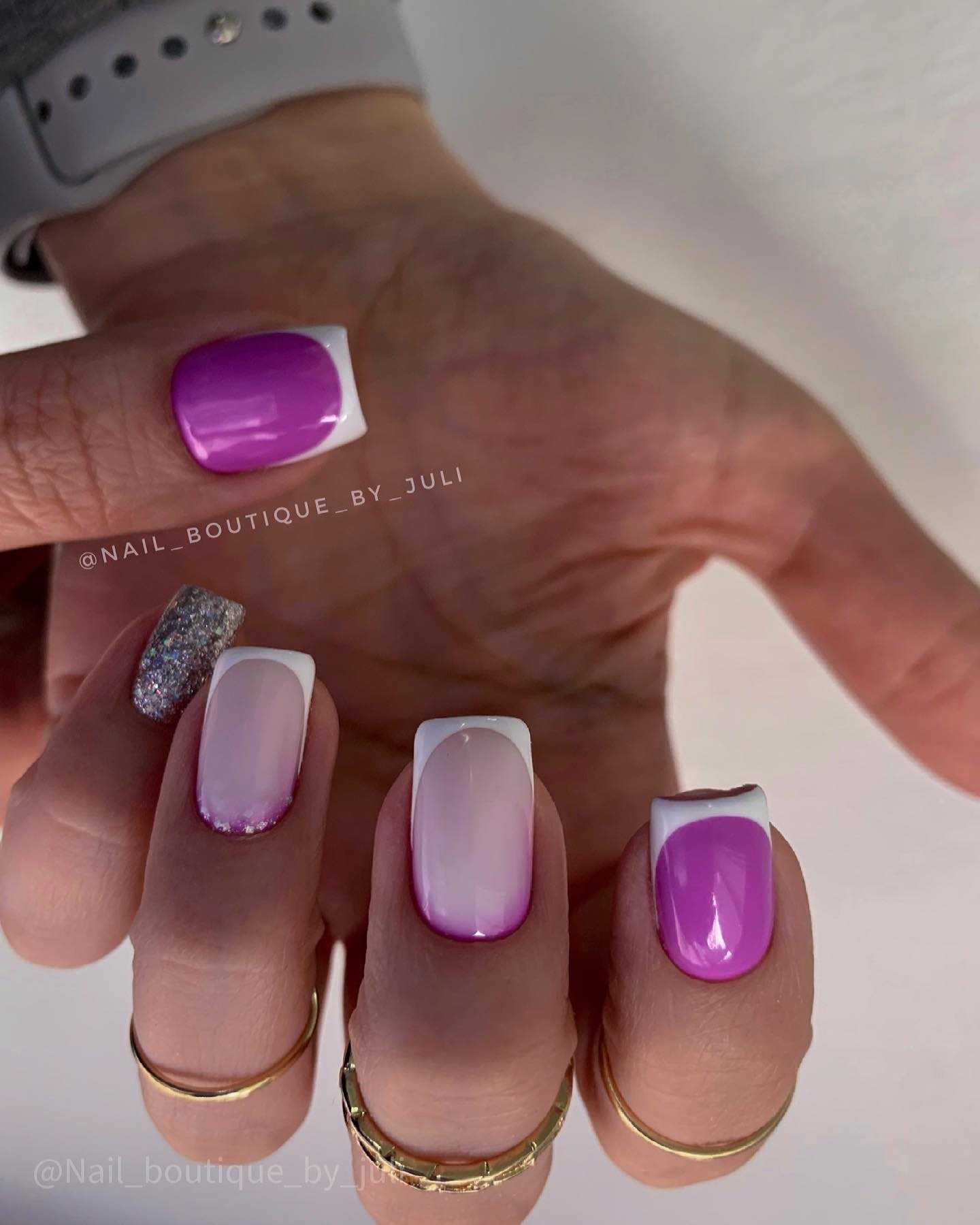 Классический френч с его белой улыбкой и розовой пластиной остается таким же, отличие в ободке — именно его делают разноцветным. Особенно интересен радужный переход от одного кончика к другому.