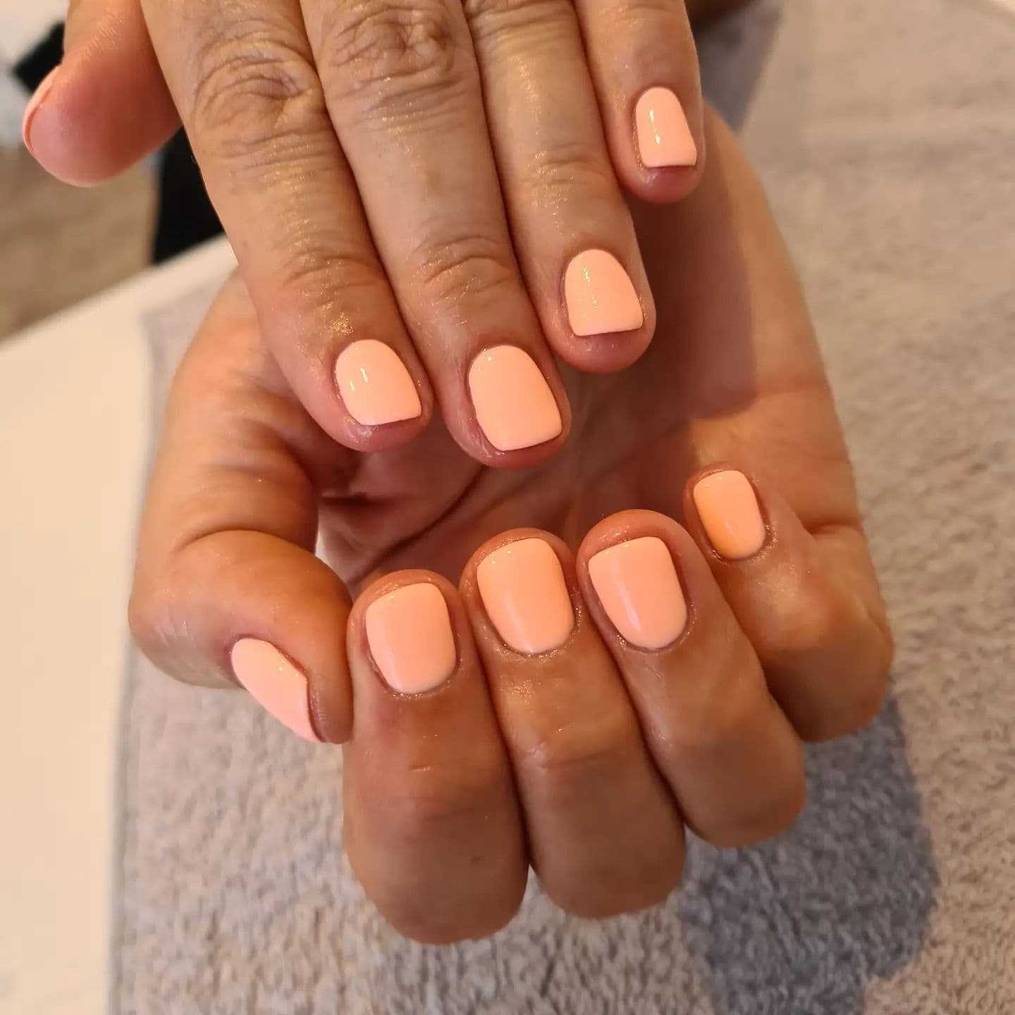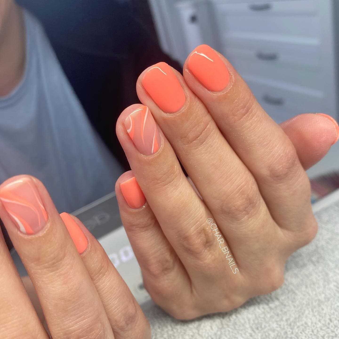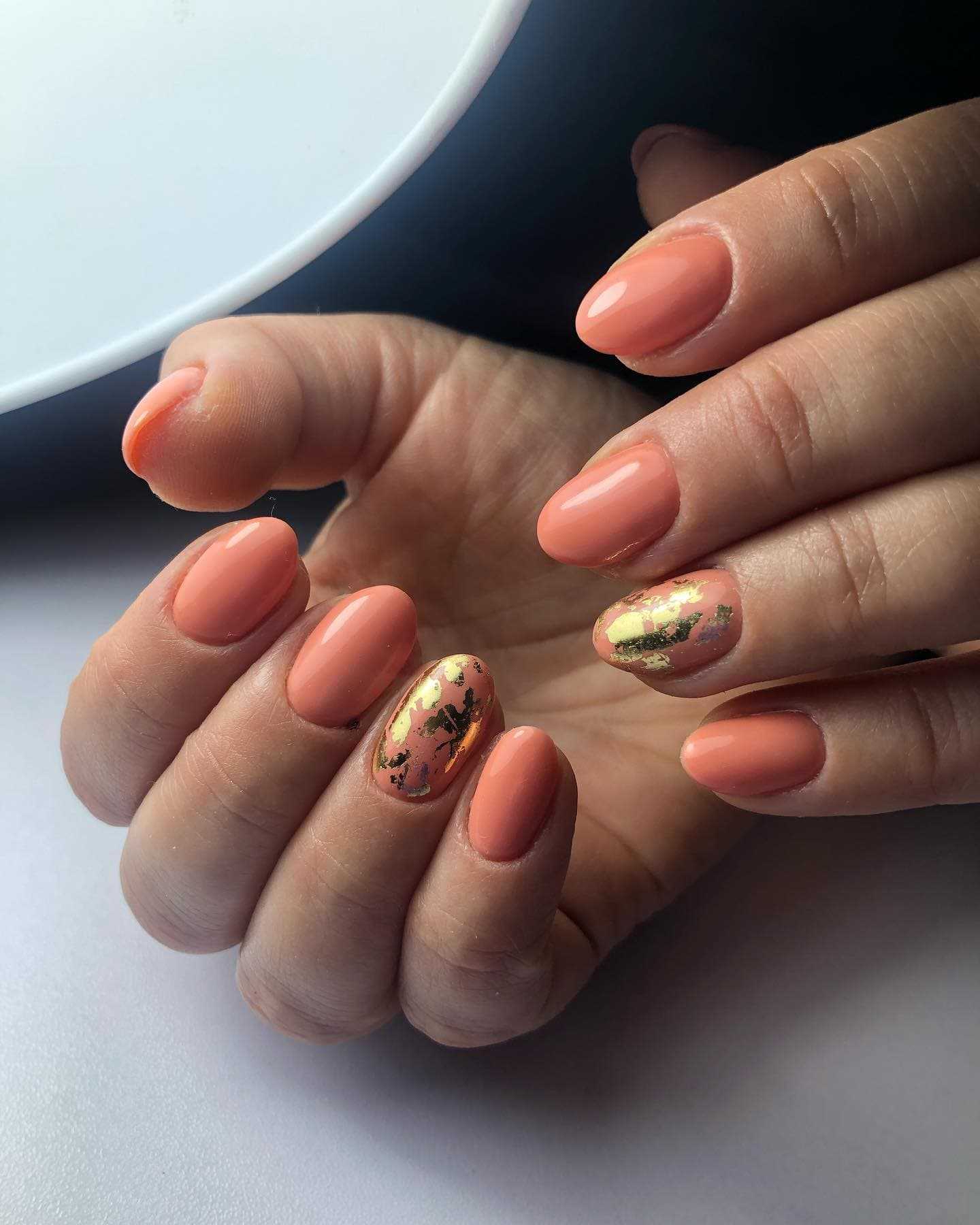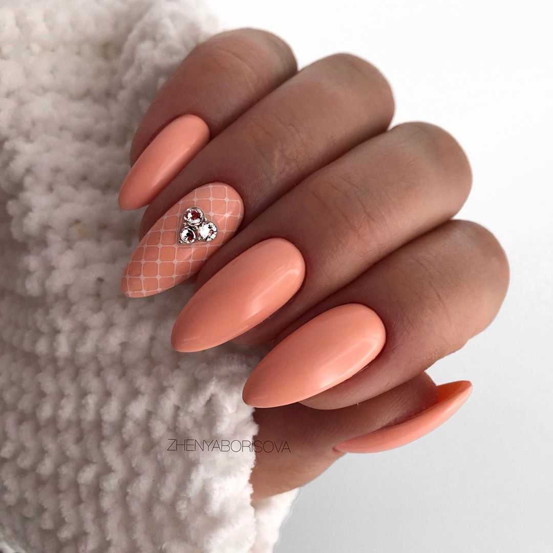 Персиковый — еще один оттенок розовой гаммы, или, вернее будет сказать, его смесь с оранжевым. Чтобы ты могла сразу представить этот цвет, вспомни, как выглядит сочный персик или хотя бы его эмодзи на клавиатуре. Это — тот оттенок, который прекрасно впишется в нежный дизайн ногтей. Несмотря на то, что иногда он может быть ярким, персиковый по-прежнему относится к группе спокойных цветов. А ты можешь смело использовать его в нежном и элегантном летнем дизайне маникюра.