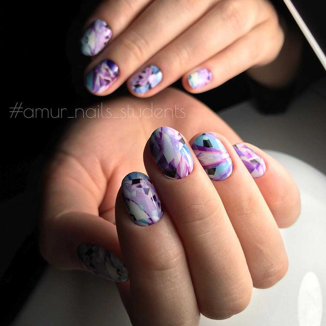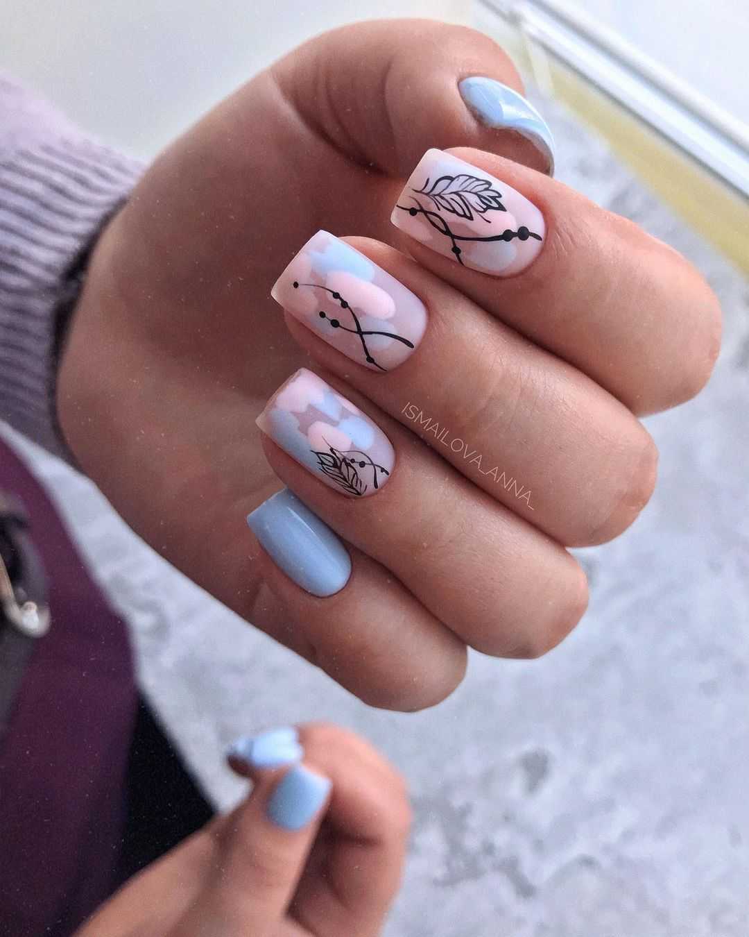 На пике популярности короткая длина ногтей. Она универсальна, поэтому ее можно выбирать на любой случай жизни. Современный дизайн здесь можно создать при помощи акварели. Нарисовать узоры или рисунки можно даже в домашних условиях. Особым спросом пользуются перья, точки, полосы и звездочки.