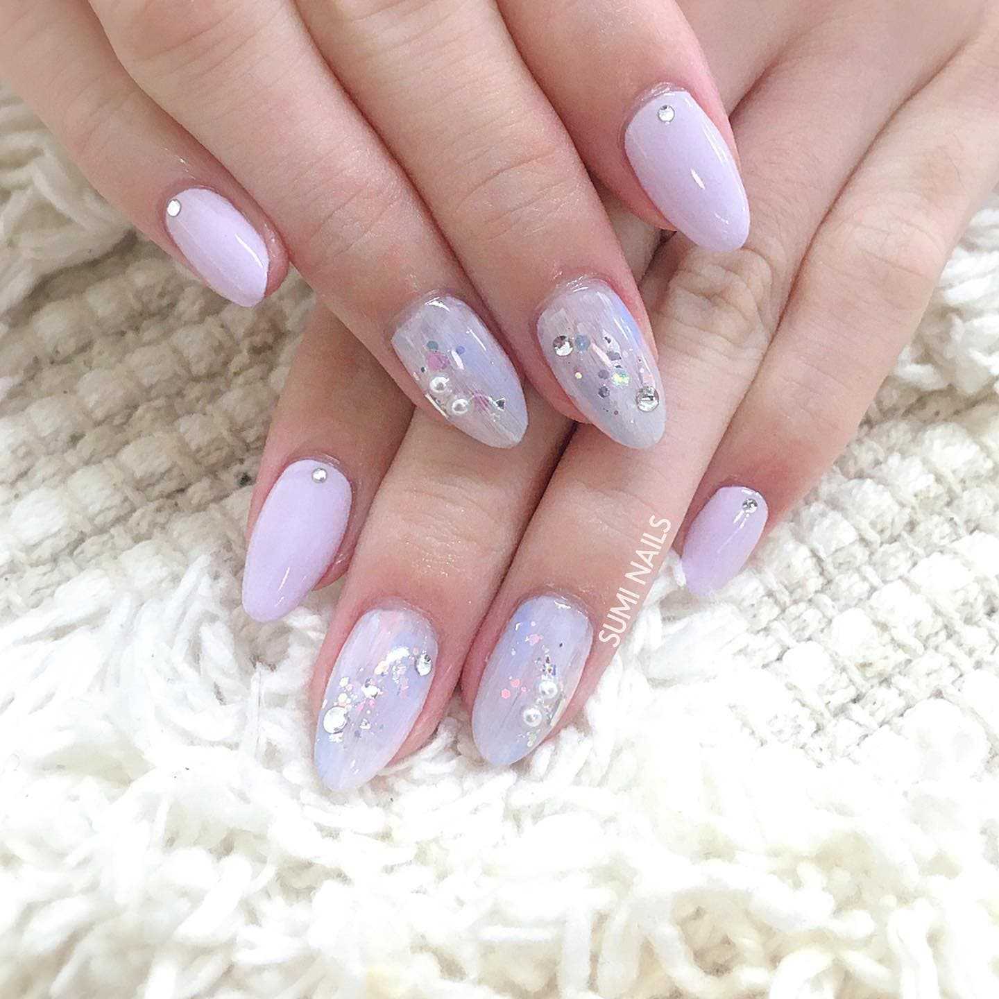 Лавандовая пастель выглядит очень нежно. Стоит избегать объемных камней, страз и даже «песка». Хорошо подойдет мрамор, жемчужная втирка.