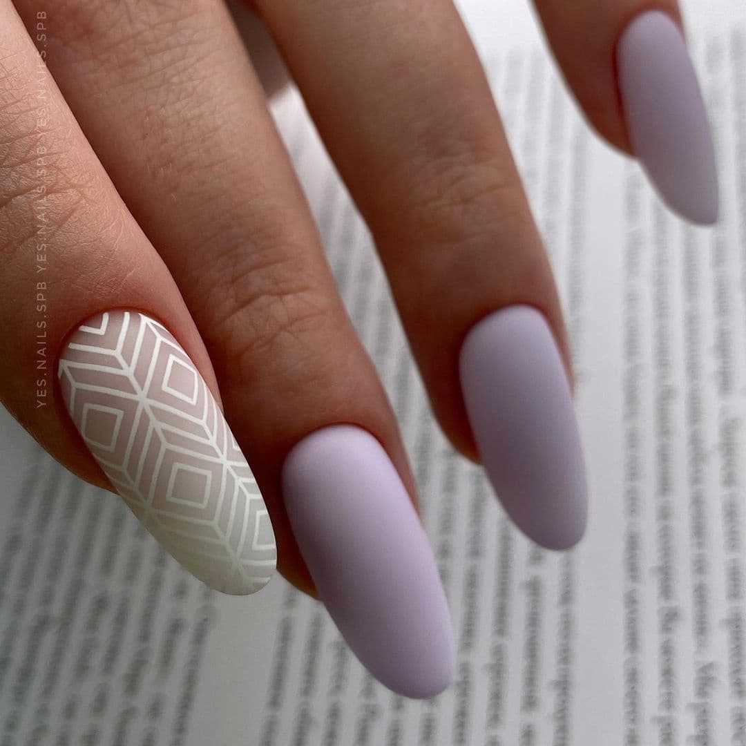 Пастель «тихая», приглушенная, потому многие отказываются от матового покрытия, а зря, потому что она совсем не уступает насыщенным оттенкам. Эффект получается необычным, словно запудренное стекло. Для добавления пикантности, добавляют акцент на один ноготь: вензеля, маленькие камушки.