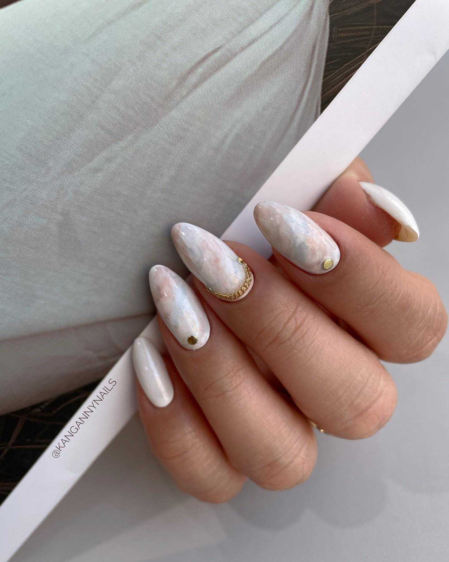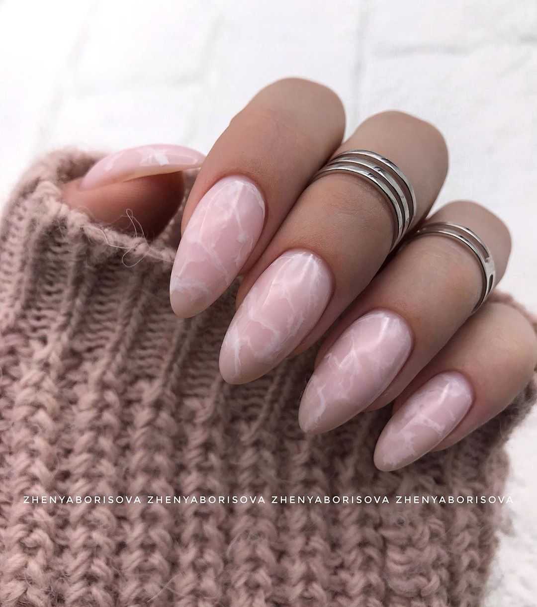 Еще один популярный тренд в нейл дизайне сезона весна-лето 2024, это «мраморный дизайн маникюра». Он очень интересно выглядит в пастельном цвете. Для того, чтобы нейл мрамор смотрелся ярче и выразительнее, можно использовать в качестве цветовой подложки более темные цвета, а сами белые прослойки делать на тоненьком слое светлых пастельных тонов лака. Такой интересный мраморный эффект смотрится очень изысканно и отлично дополняет сдержанный и нежный дизайн маникюра в пастельных тонах.