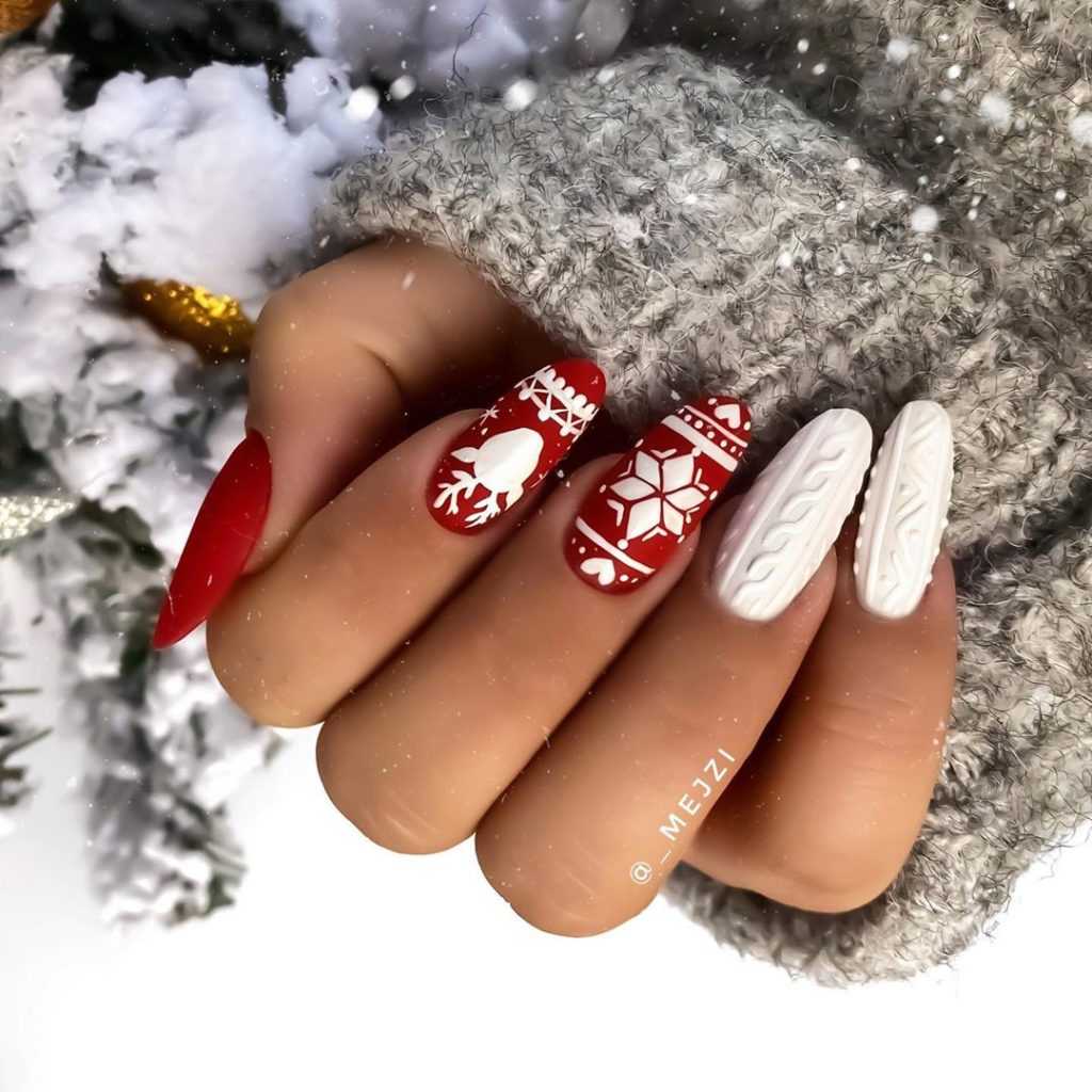 Так званый эффект свитера на ногтях это не только вязаный маникюр зима, но и зимний маникюр с орнаментом напоминающим узоры уютных свитеров. Популярнейшие скандинавские узоры со снежинками, зверьками или сердечками точь в точь повторяют рисунок маникюра на зиму.