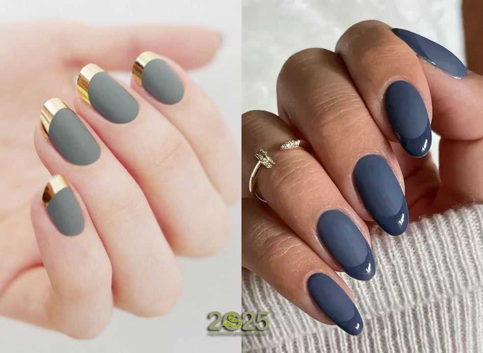 В двуцветном маникюре сочетается по принципу пастельного ряда с нюдовыми тонами, по принципу насыщенного варианта с темно-синими тонами.