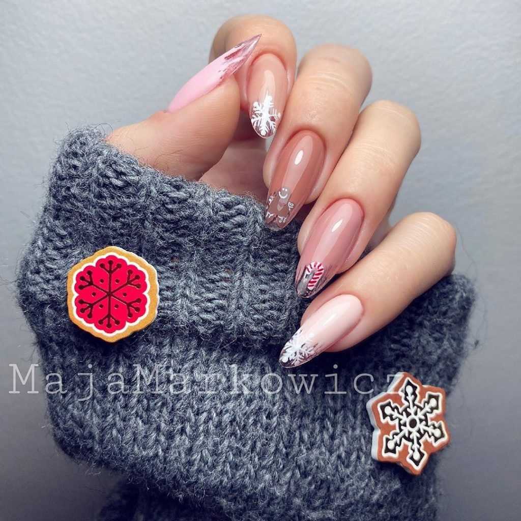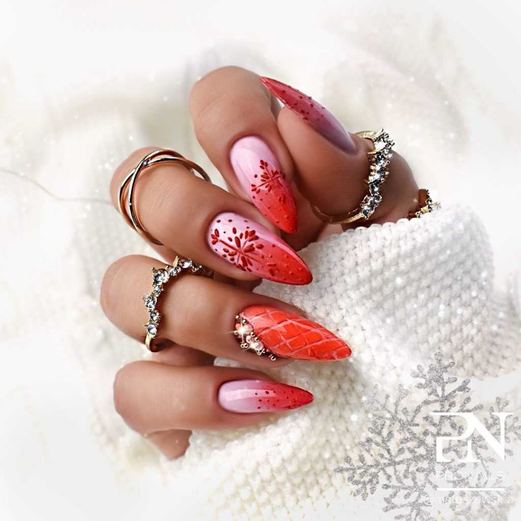 Обычно с острой формой миндаля, девушки выбирают дизайны с нежными оттенками и втиркой или стразами, так ногти смотрятся максимально празднично на Новый год.