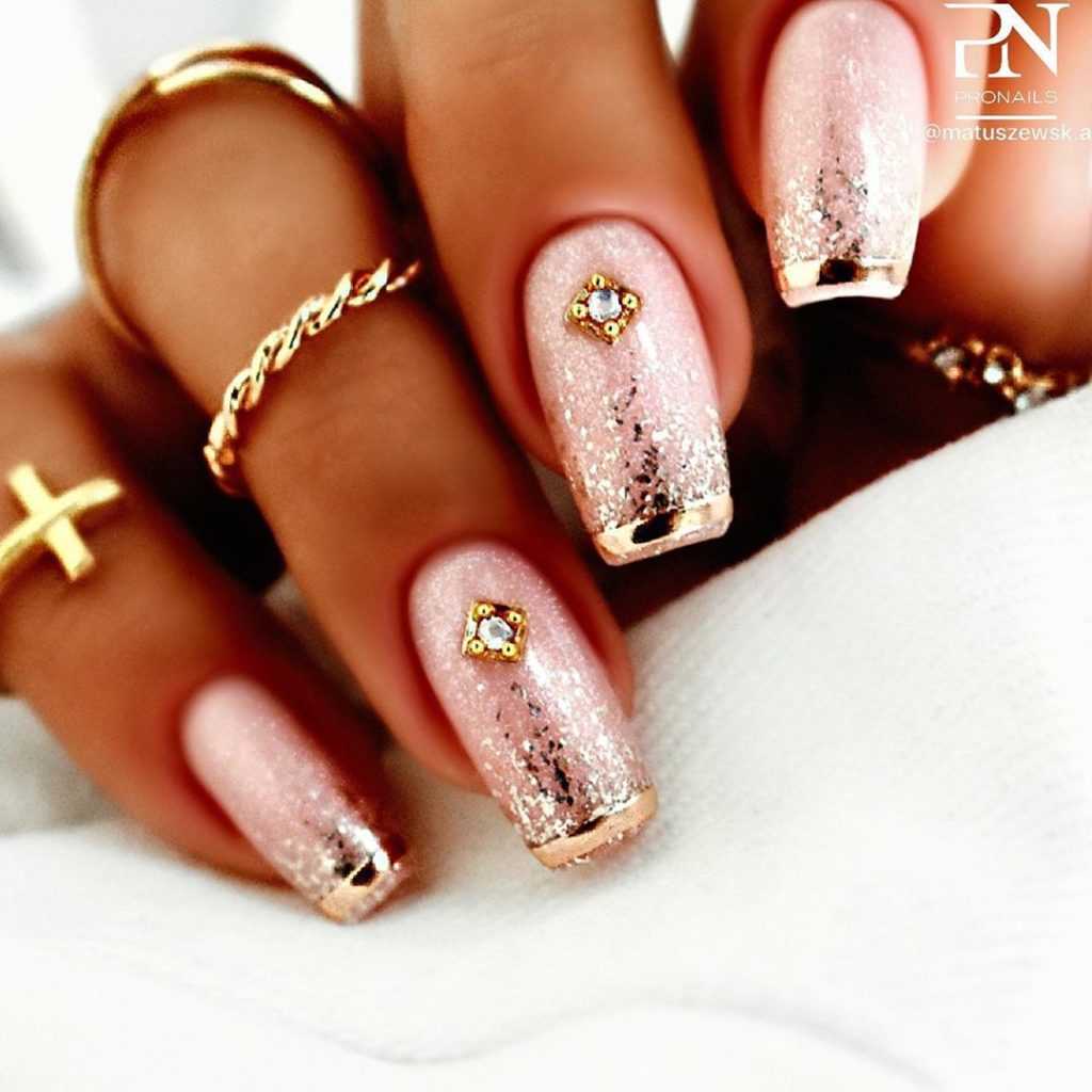 Блестящий маникюр на Новый год универсален в нежных тонах. Носят его каждый день, но особенно выигрышно блестки будут смотреться на вечерних мероприятиях. Создать дизайн можно самостоятельно, главное запастись блестящими лаками или сухими частицами. Второй вариант требует закрепления прозрачным лаком.