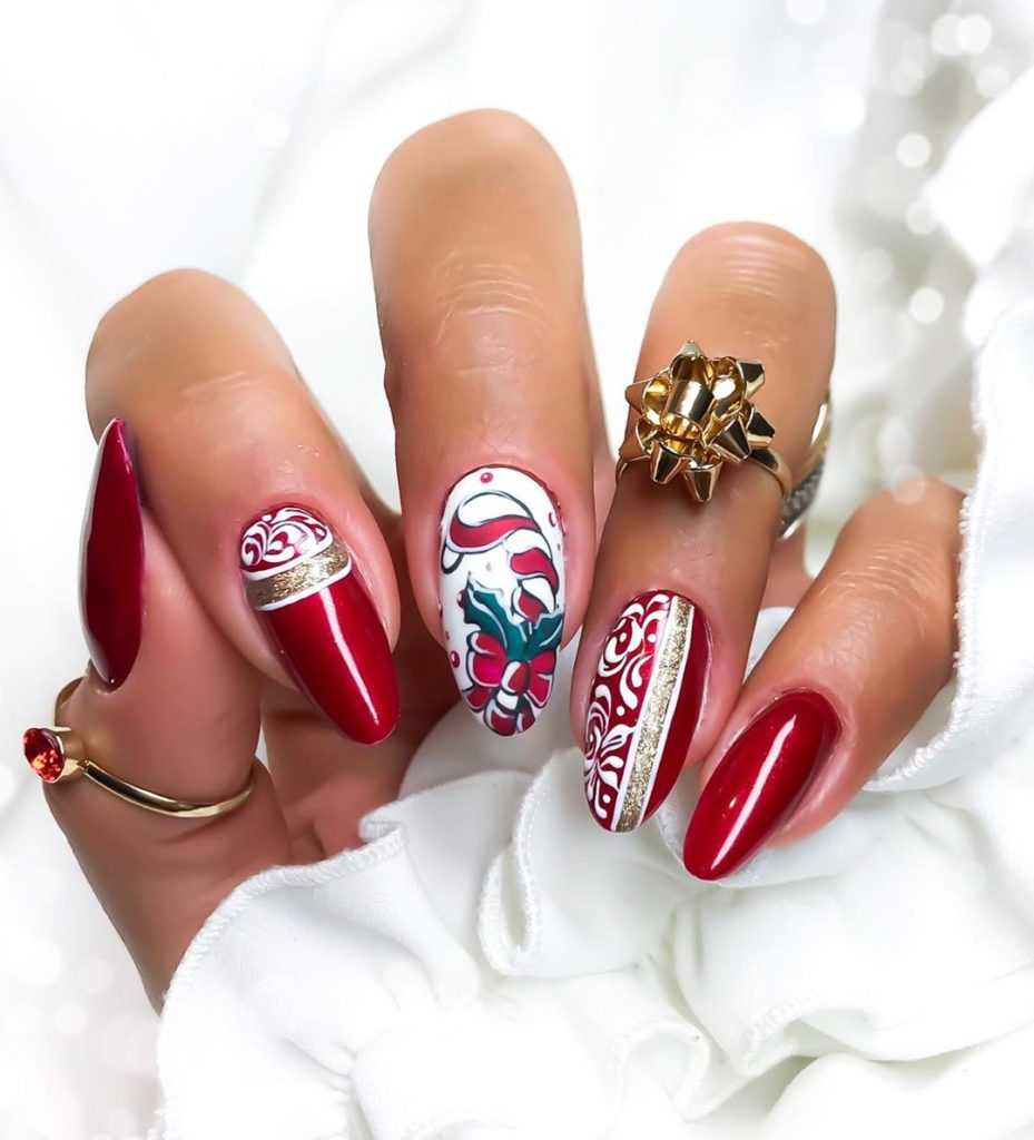 В нейл-арте может присутствовать прорисованный элемент елки, рождественских носков с подарками или рога северного оленя. Однако нужно учитывать, что новогодний маникюр не должен быть слишком кричащим.