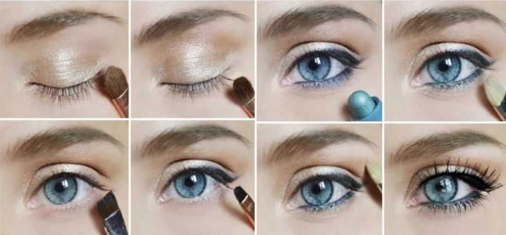 Модным для голубых глаз будет макияж в светло-песочных или золотистых оттенках теней и черные стрелки. Густо накрашенные ресницы гармонично отобразят цвет глаз. Для создания вечернего макияжа рекомендуется применение палитры темных оттенков. Тенденция — от перламутрового и серого до яркого черного.