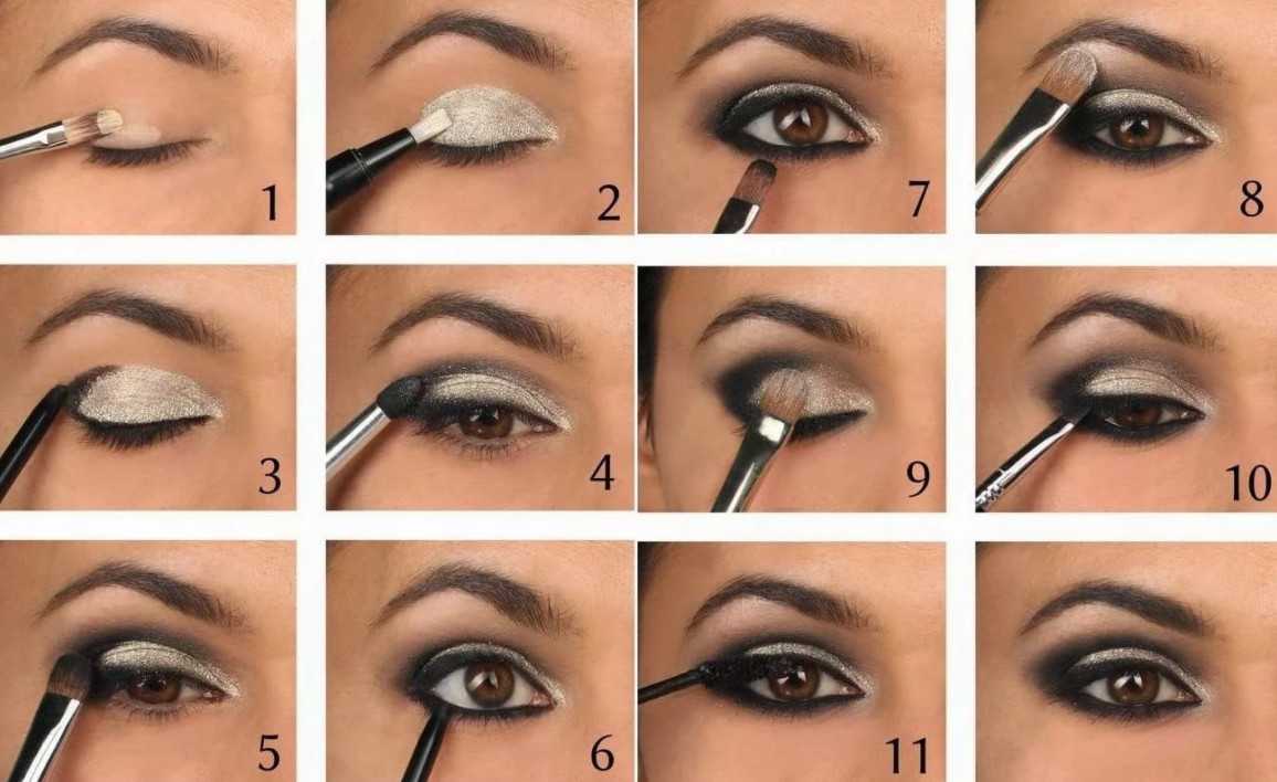Лучшим вариантом вечернего макияжа для кареглазых девушек будет привычный смоки-айс в переливе от светло-бежевого к темно-шоколадному оттенку или черному. Пошаговая инструкция его создания — на фото.