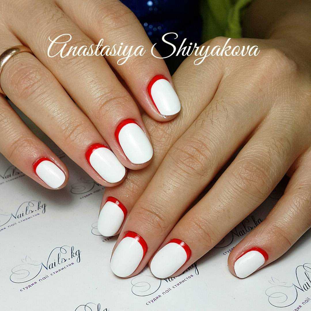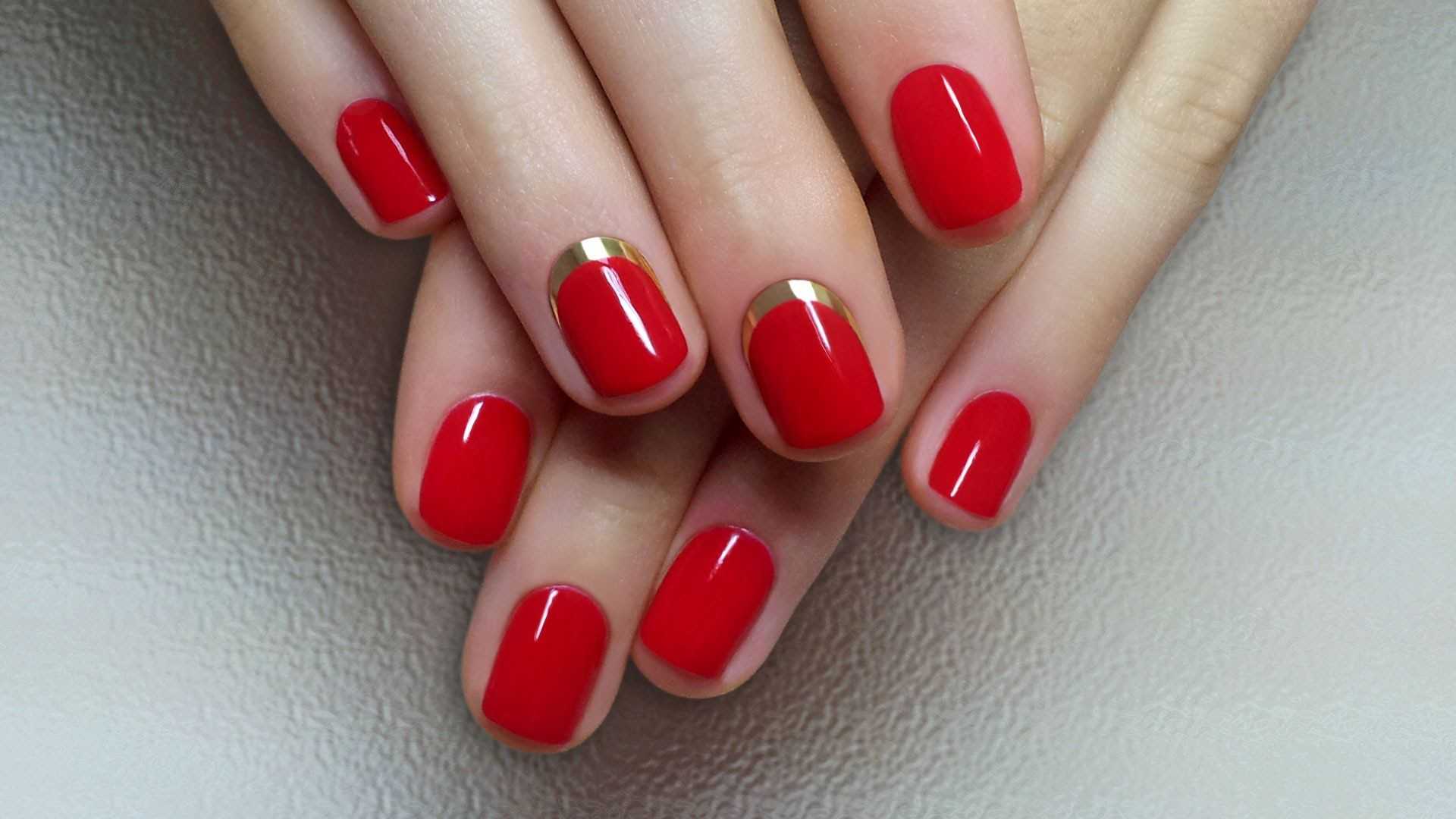 - насыщенные оттенки красного геля-лака принято сочетать с золотистыми, черными или белыми улыбками;