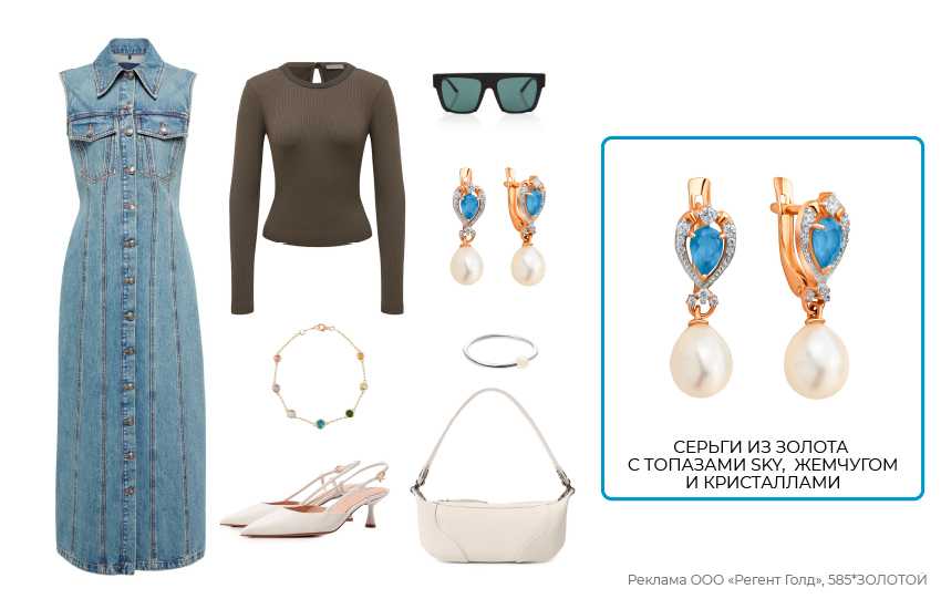 Подобный комплект вполне подойдет даже для нестрогого офисного дресс-кода, а чтобы длинный сарафан не утяжелял фигуру, дополним его светлой обувью и зададим женственное настроение серьгами с жемчугом и топазами.