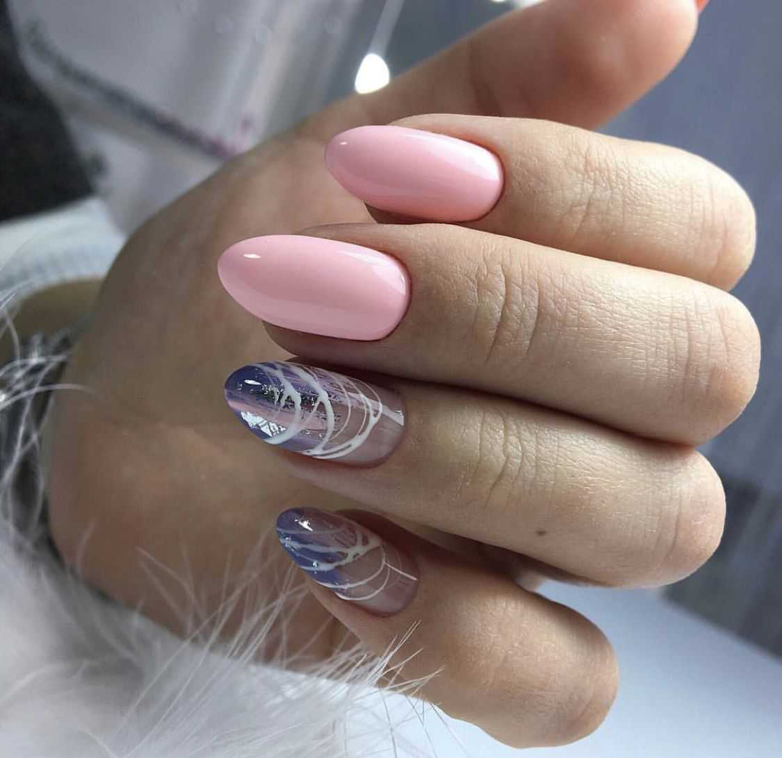 Комбинируйте лак белого цвета с нежными оттенками. Бело-голубой амбре все также остается в тренде. Именно эти два цвета символизируют гармонию и спокойствие. Можно добавить любой пастельный оттенок. Маникюр получится нежным, притягательным и аккуратным: Смотрите подборку голубого маникюра. Чудесный универсальный вариант как для офиса, так и для праздничного мероприятия.