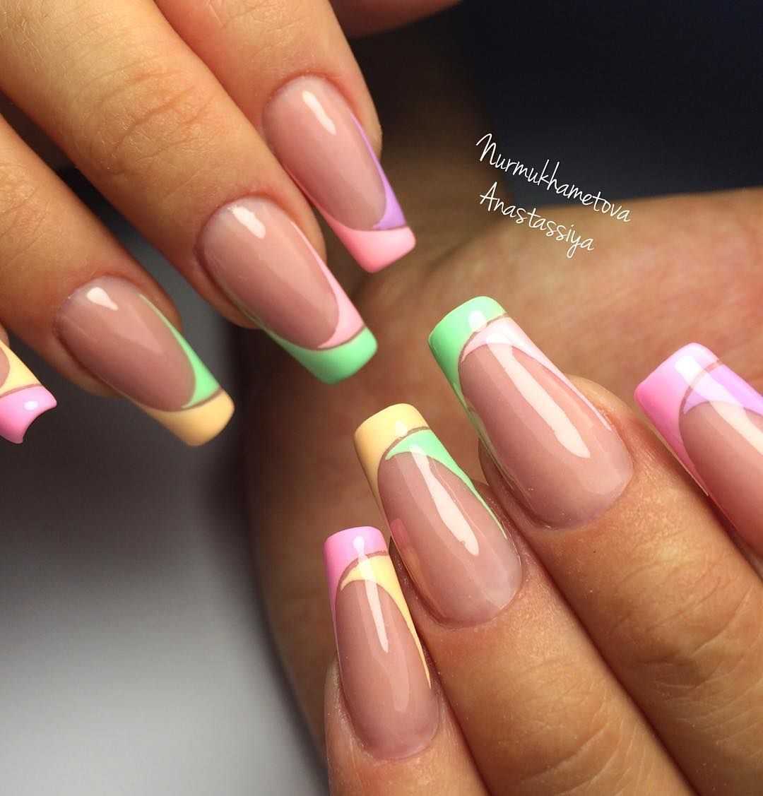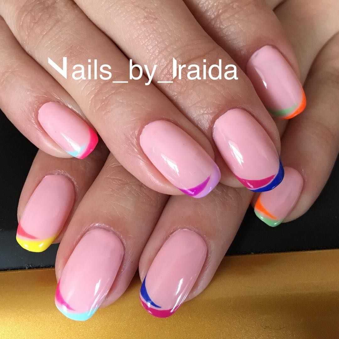 Одна из самых интересных современных тенденций — это разноцветный френч. Это дизайн, когда каждый из ноготков оформляется в свой цвет. Чаще всего такой прием используют летом. Мастера не рекомендуют перегружать такой маникюр другими элементами декора. А для базы стоит выбрать максимально нейтральный оттенок. Например, молочный, нюдовый, любой пастельный. Если хочется добавить декора, рекомендуем выбрать один акцентный палец на руке и нанести на него, например, рисунок стразы.