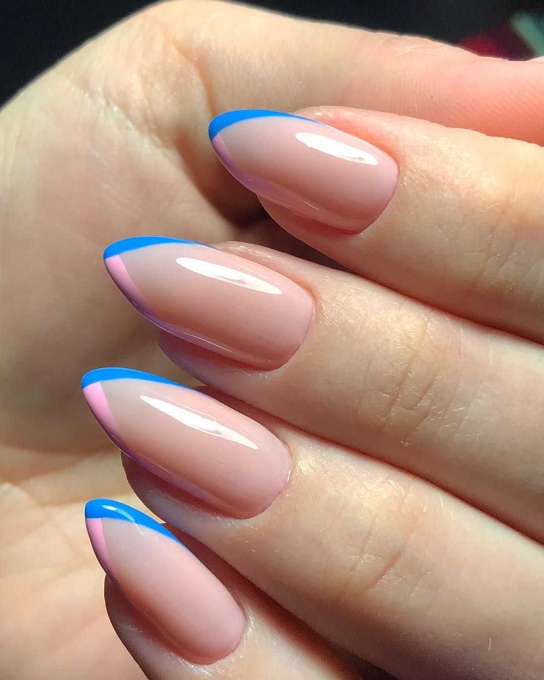 Не теряет актуальности в 2019 году и обратный лунный маникюр, подходящий для ногтей любой длины. При этом выгодным будет сочетание двух лаков одной цветовой гаммы: красного и розового, либо синего и голубого.
