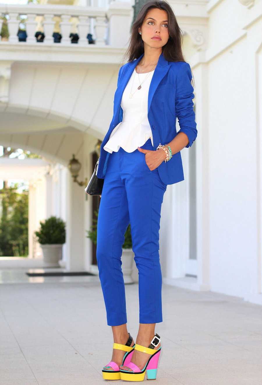 - Яркие синие брюки. За исключением традиционно белого, черного и бежевого, они прекрасно сочетаются с желтым, розовым, красным, оранжевым. Для смелых личностей, которые не боятся выделиться подойдет тотал-лук. Для этого в тон штанам подберите жакет, блузу или свитер и сумку. Такой вариант хорош для теплого времени года. Насыщенные краски подарят отличное настроение и вам и окружающим.