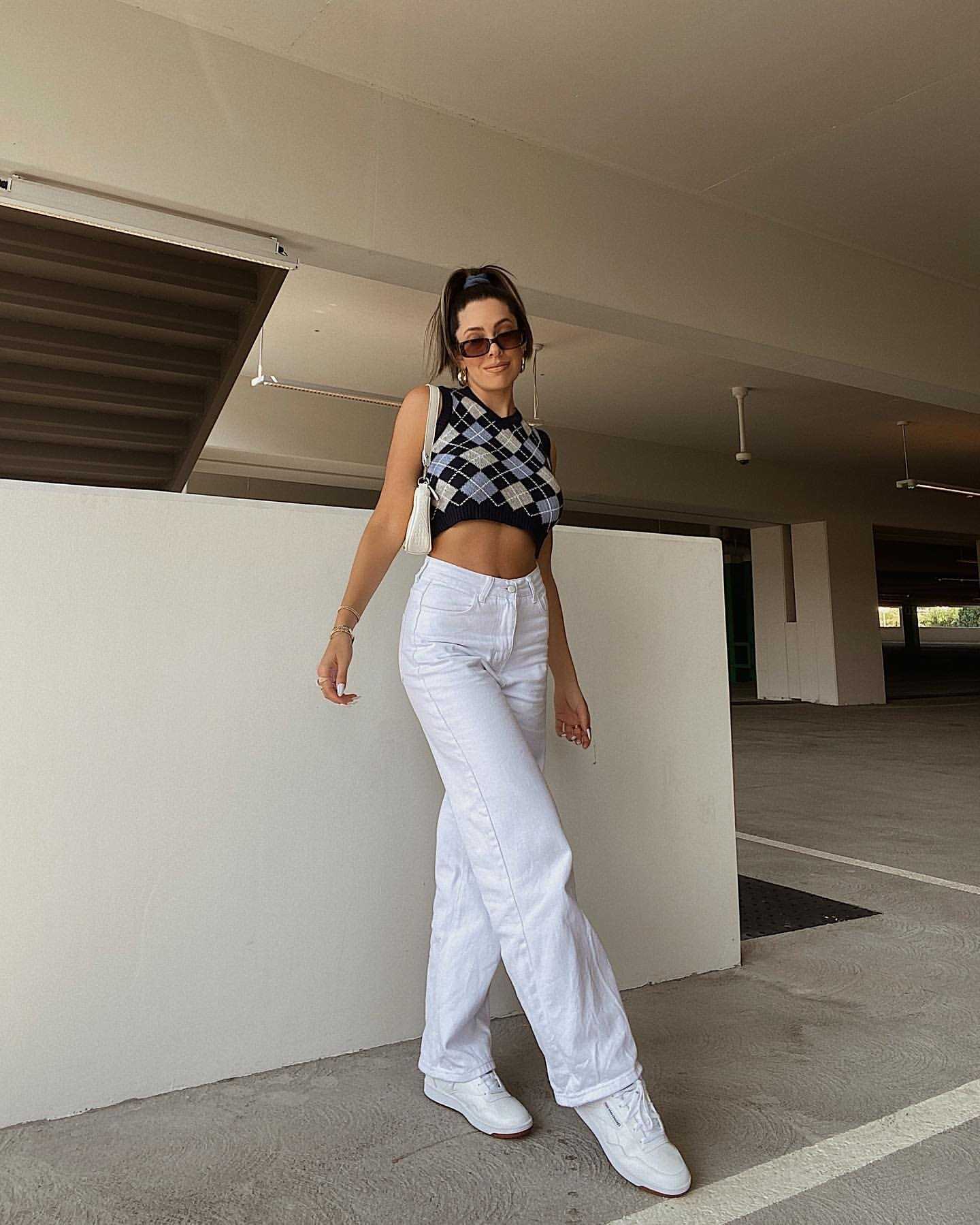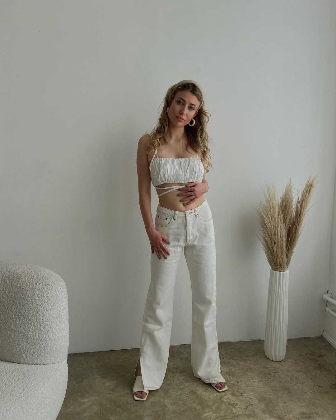 Белые джинсы и кроп топ. Маст-хэв 2024 — это эффектное сочетание джинсов с укороченным топом. Топ может быть как с короткими, так и с длинными рукавами. Такая одежда удачно подчеркнет линию живота и пресс. Ну а если вы немного стесняетесь, то можно сверху накинуть кардиган.