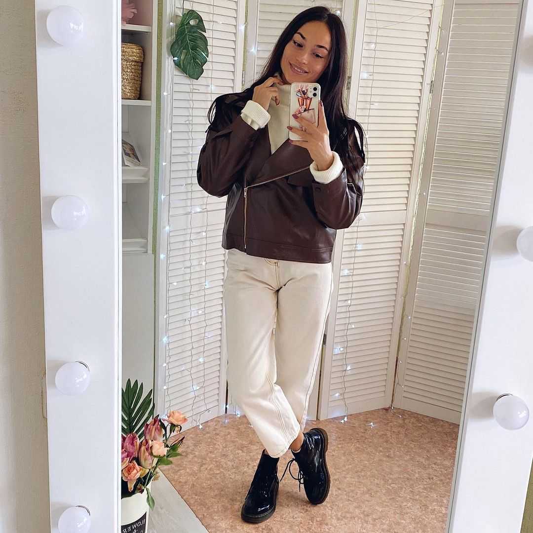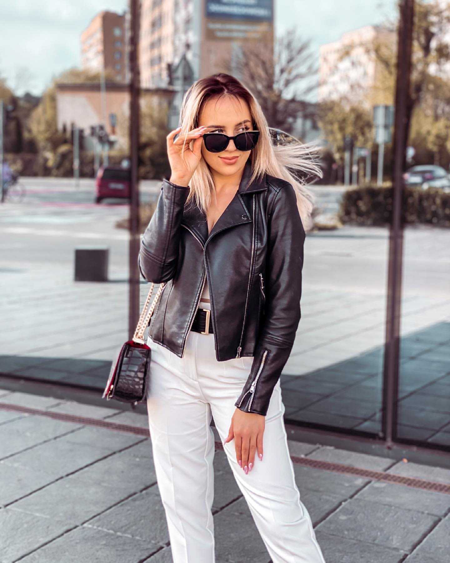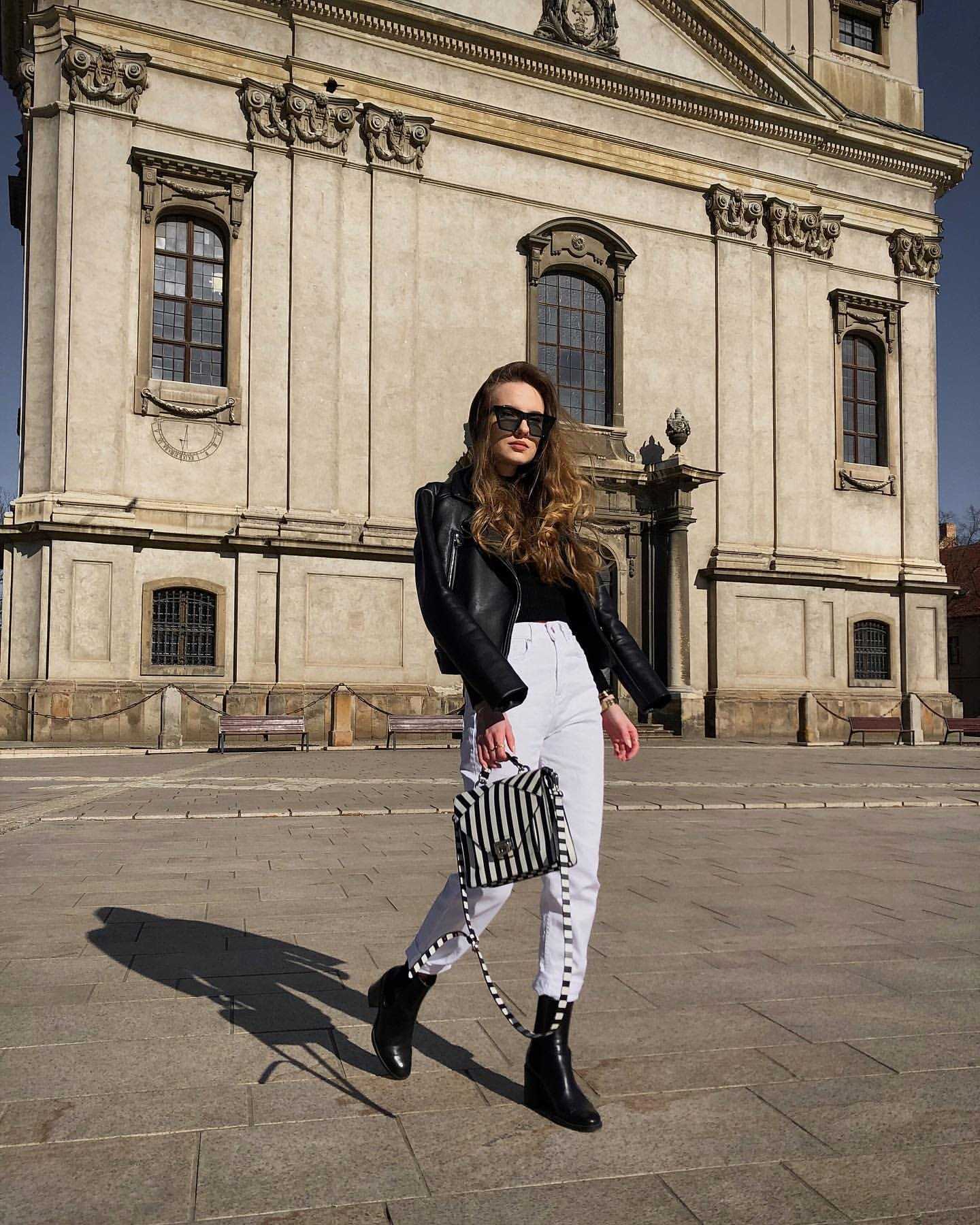 Белые джинсы и кожаный верх. Необычное сочетание, которое стало мега популярным в этом году. Дополните белые джинсы кожаной курткой, косухой или кожаным тренчем